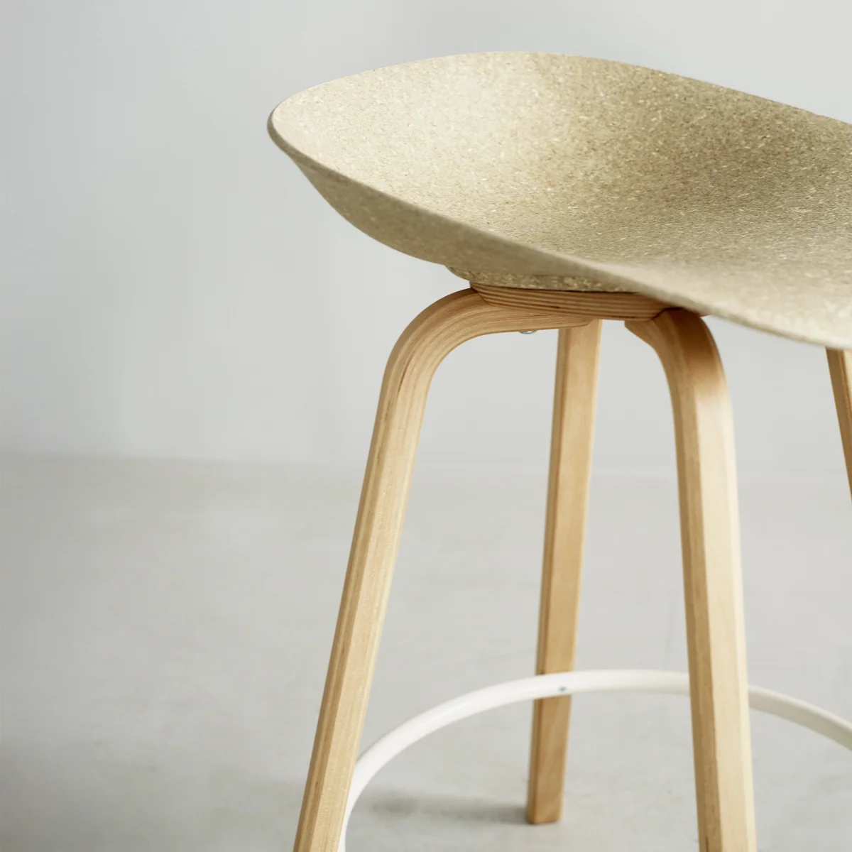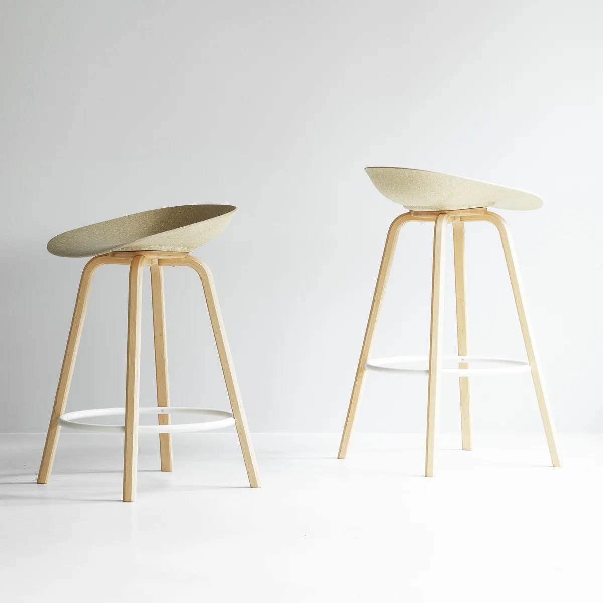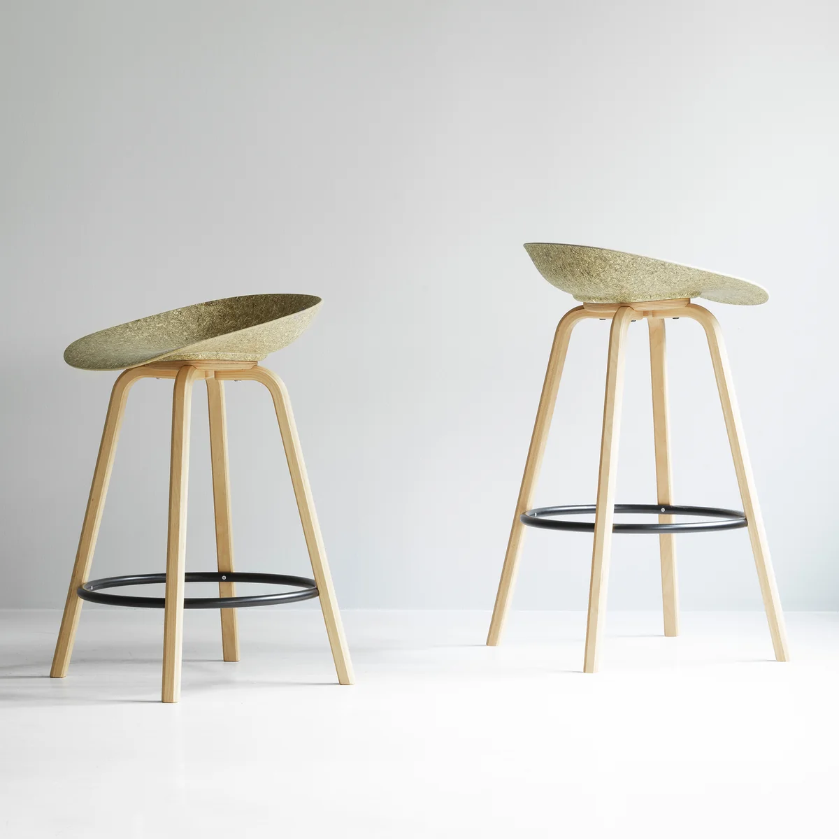 The Mat collection combines a seat shell made of hemp fibers with a specially developed compression process that combines stability and sustainability. The bar stool versions with a wooden frame are additionally equipped with a foot ring made of powder-coated steel for more comfort and stability.