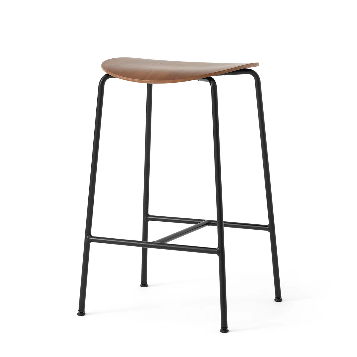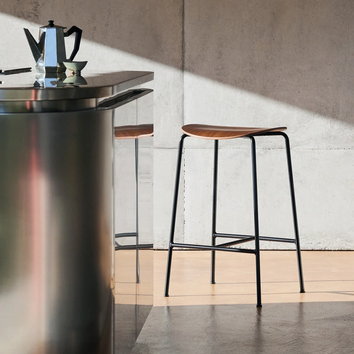 The Pavilion bar stool from Anderssen & Voll for & Tradition combines Scandinavian elegance with functional stability. Made from bent steel tubes and compression-molded veneer, the stool impresses with its lightweight yet robust construction. The seat is finished with a water-based lacquer, which ensures a natural look and long-lasting quality. With its slim silhouette, the bar stool blends harmoniously into modern kitchens, bars and workspaces.