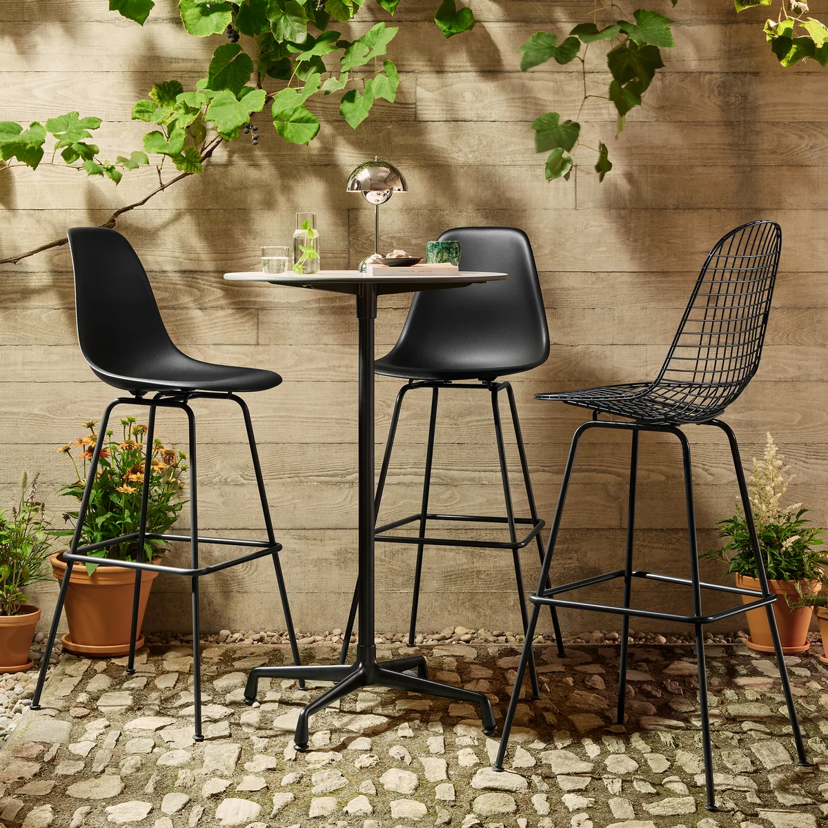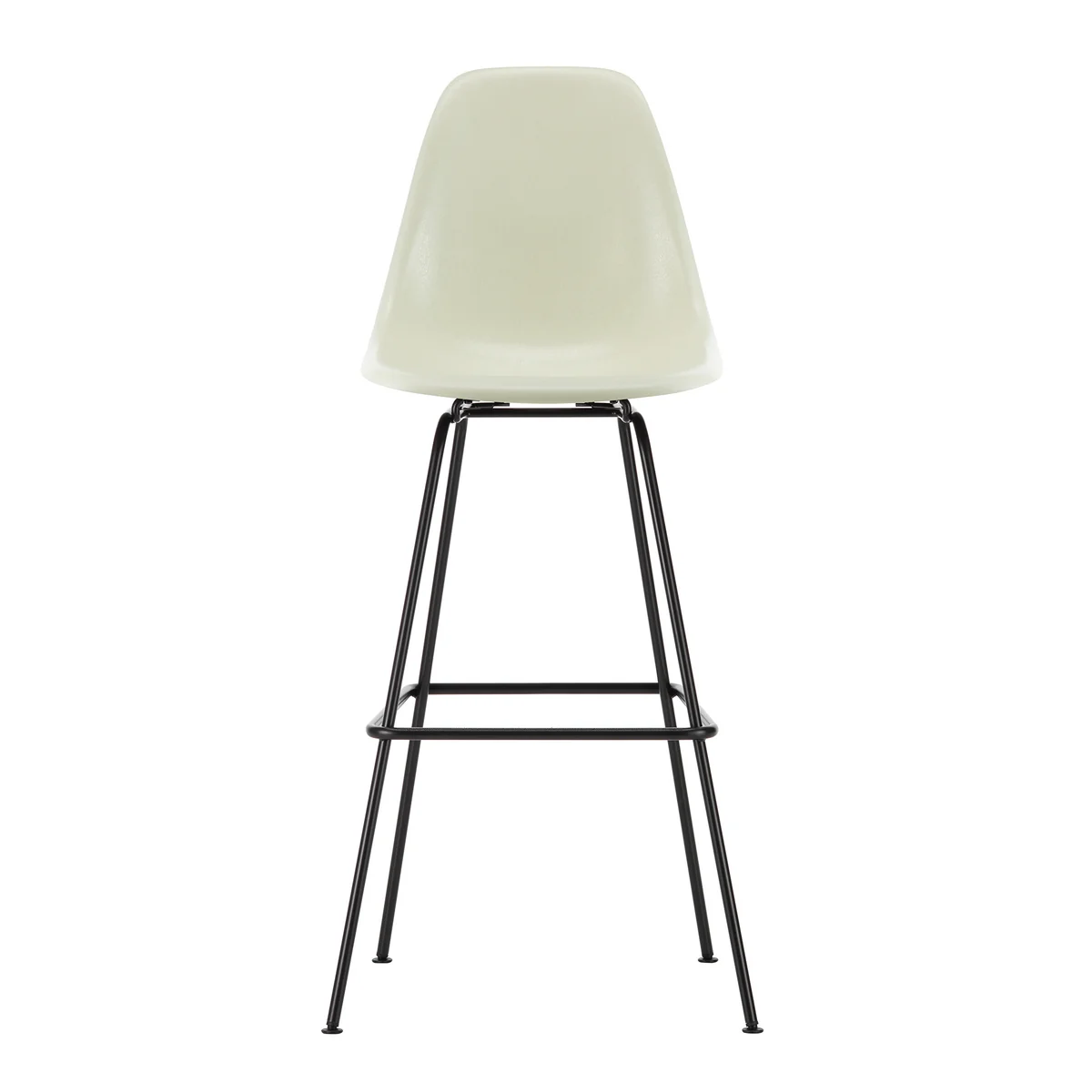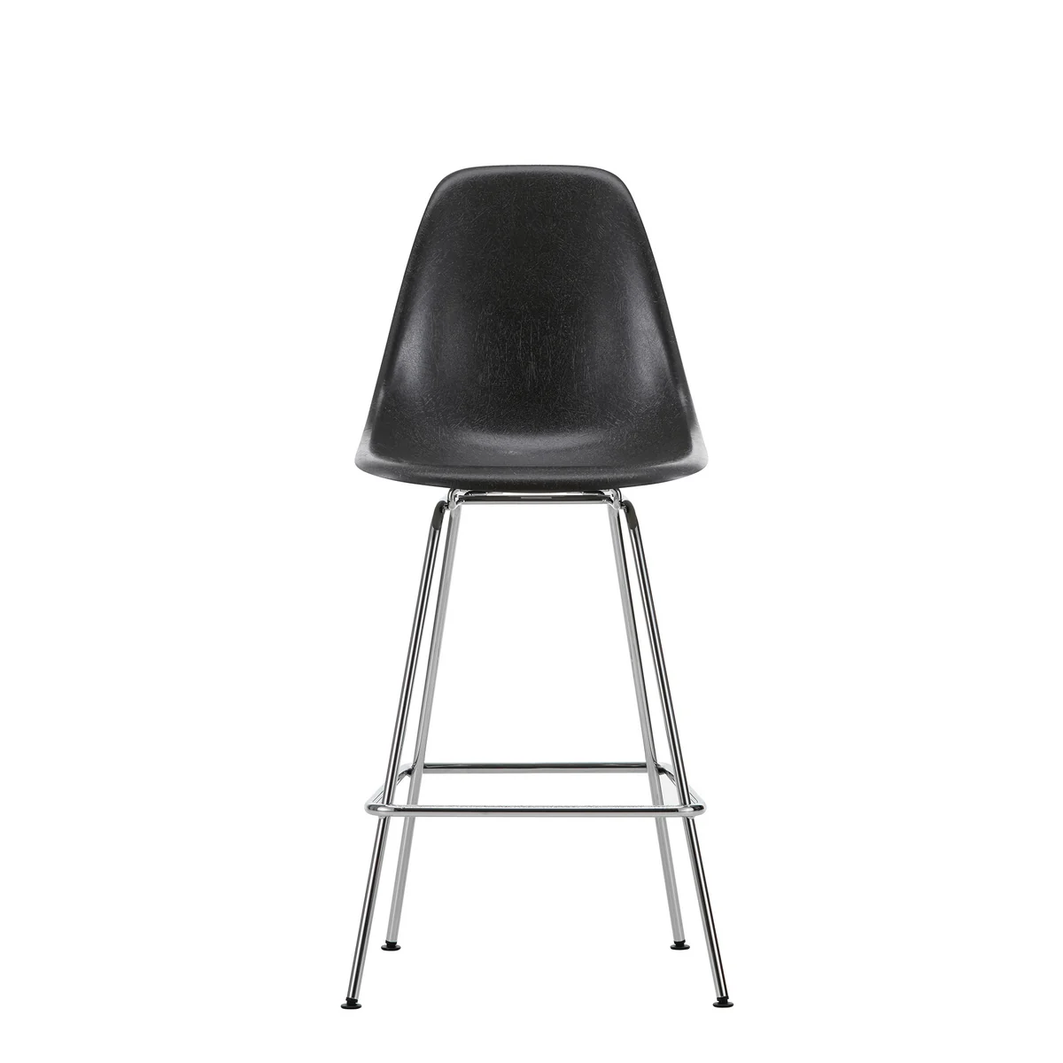 Charles and Ray Eames developed the Eames Fiberglass bar chairs for Vitra , Charles and Ray Eames developed the first industrially manufactured chairs made of plastic. Their organically shaped seat shells are available with different bases. The four-legged base of the Eames Fiberglass bar chair is available in two heights: medium for typical kitchen bars and high for high tables. It is either black powder-coated or chrome-plated and has a footrest.