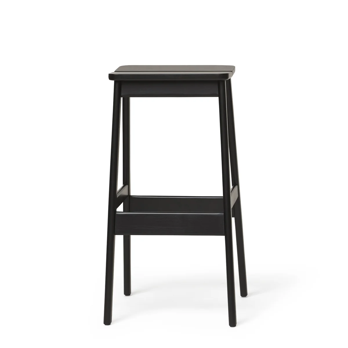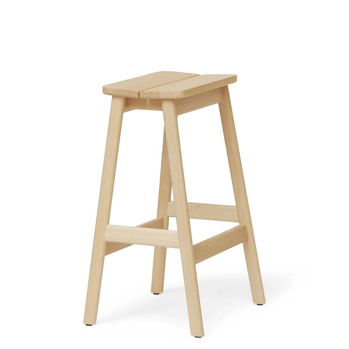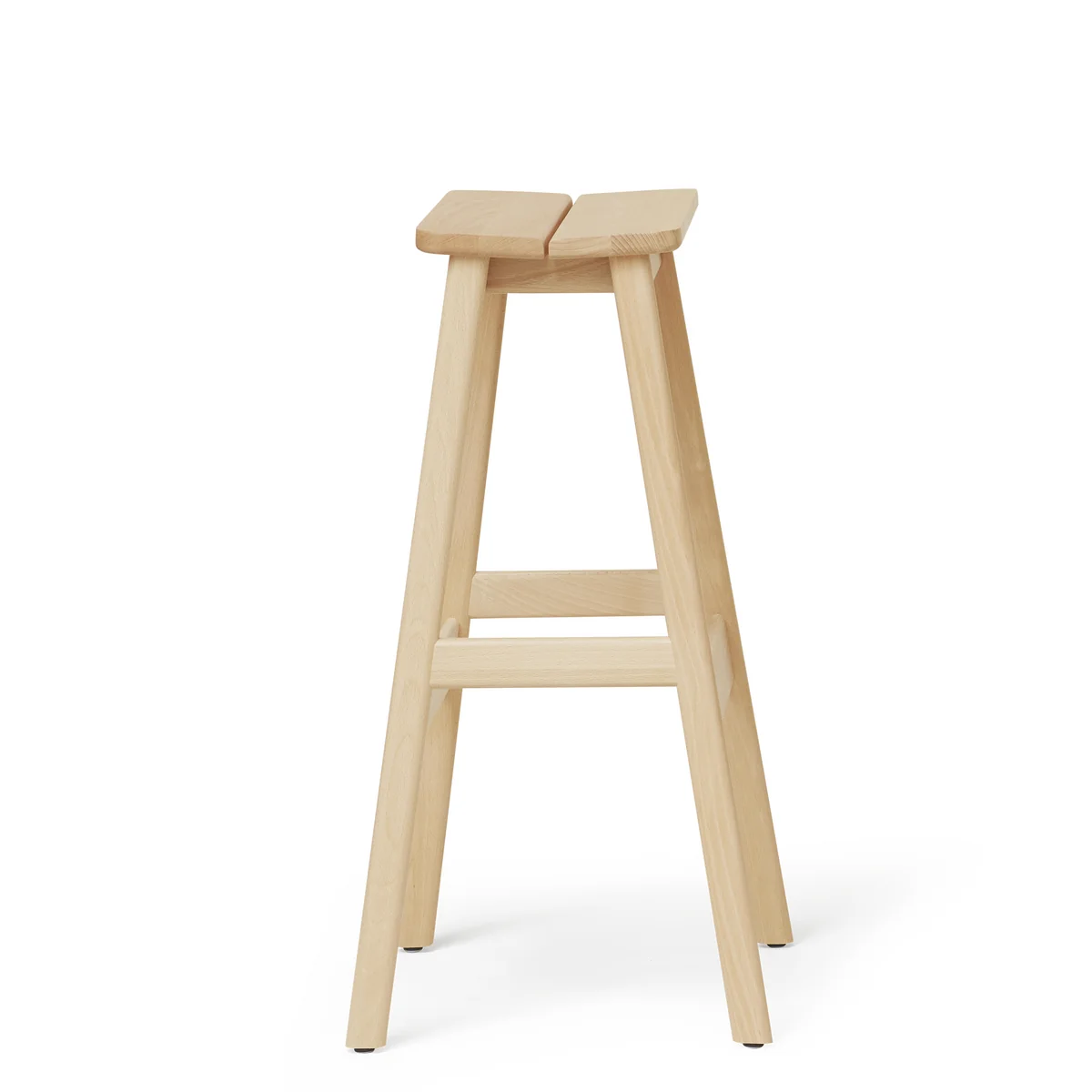 The Angle bar stool from Form & Refine is a versatile stool that meets all needs and requirements in terms of form, functionality, comfort and durability. Both sides of the seat are inclined at 5 degrees to each other, which increases the comfort of sitting immensely and is also a unique design feature. The Angle bar stool is made of wood with a sturdy brass footrest.