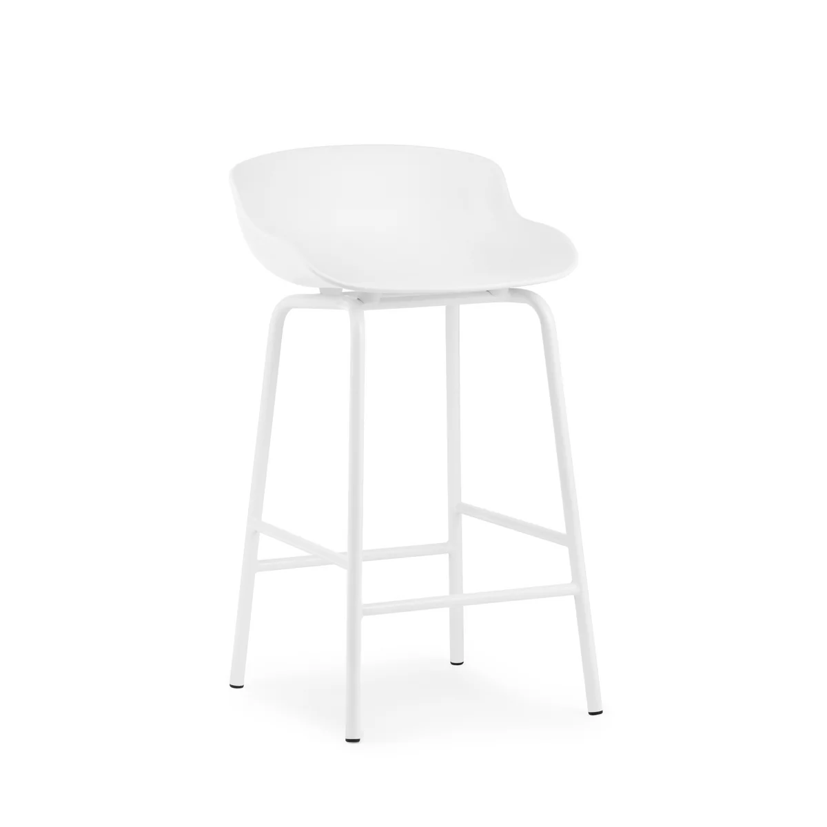 The bar stool consists of a four-legged frame in powder-coated steel or oak and a seat shell in polypropylene. Both parts are painted in the same colour, giving the stool a particularly calm and uniform appearance. Available in different colours and heights, the bar stool fits perfectly into different ambiences, public and private spaces.