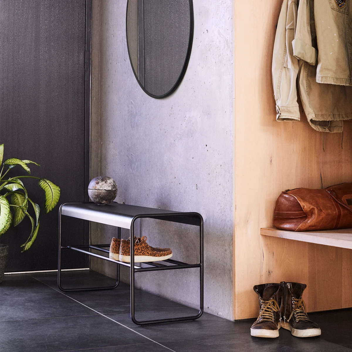 The Copenhagen bench by Nicklas Lohmann for Muubs is perfect for any living space thanks to its minimalist design. It is made of iron and subsequently painted black. Copenhagen Can be ideally placed in the entrance area or at the end of the bed. The lower shelf can be used wonderfully to store shoes or all sorts of boxes and crates.