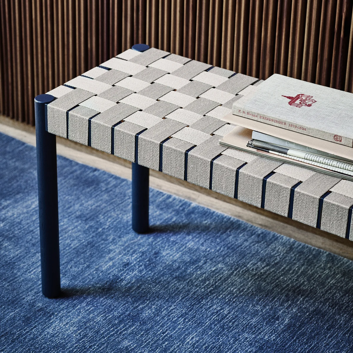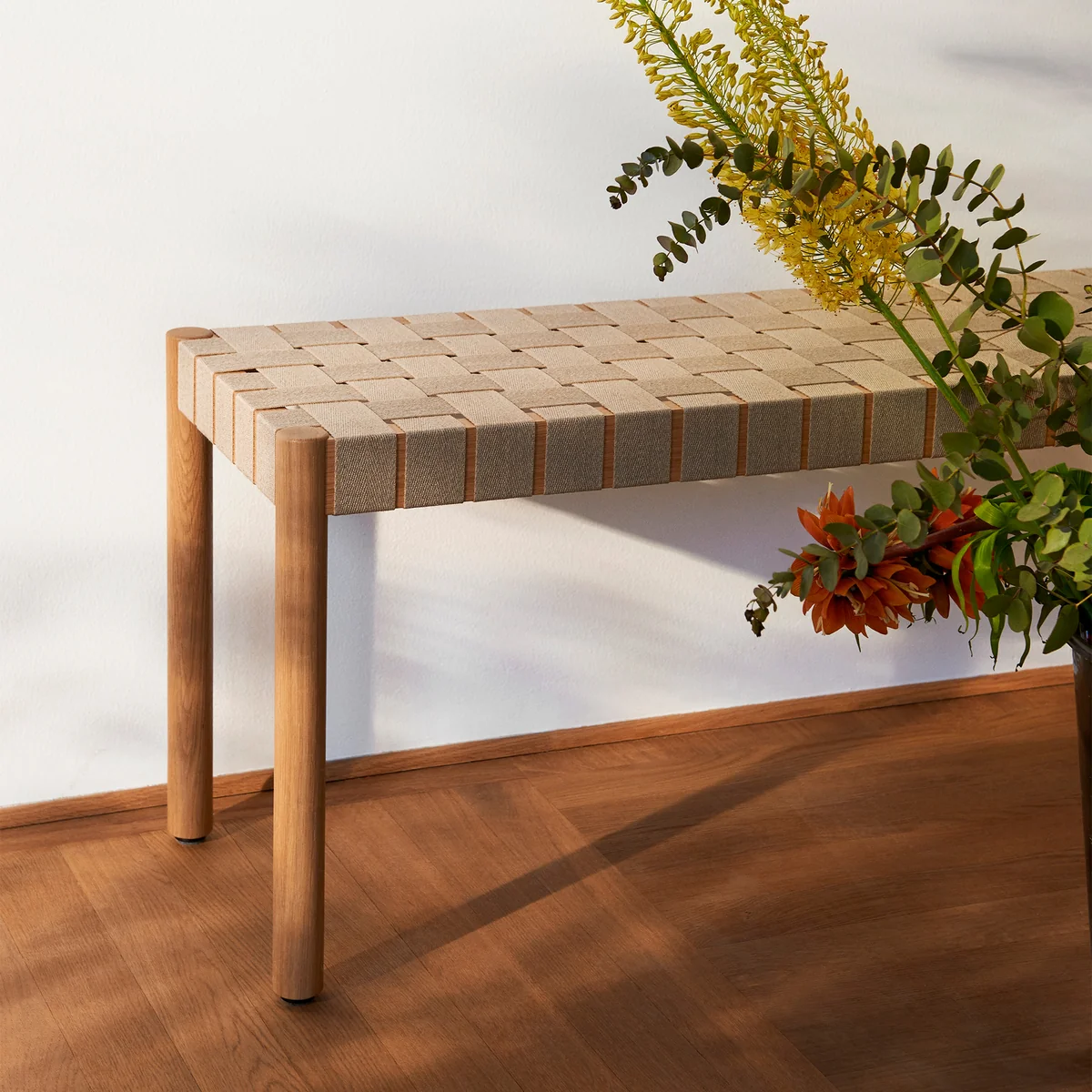 The frame of the bench is made of solid, lacquered oak and the seat is made of hand-woven, natural linen. The bench is available in different sizes and with different frame colours.
