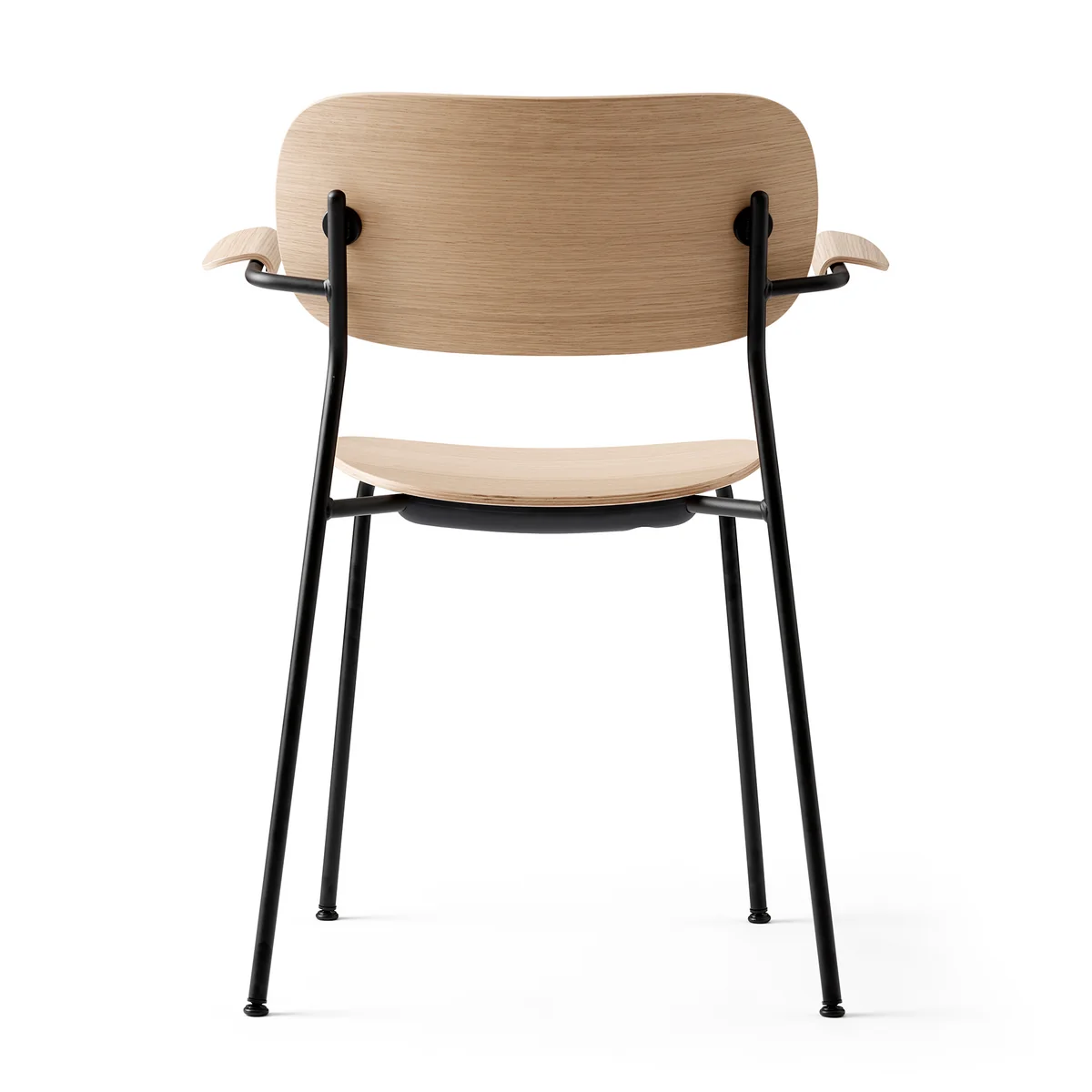 The Co Dining Chair offers comfort due to its wide, slightly curved backrest and armrests. A filigree steel frame serves as the chair's base and provides a light and airy appearance. The aesthetic bears the signature of design studio Norm Architects, which has focused on warm-looking materials and soft curves for the Co Dining Chair.