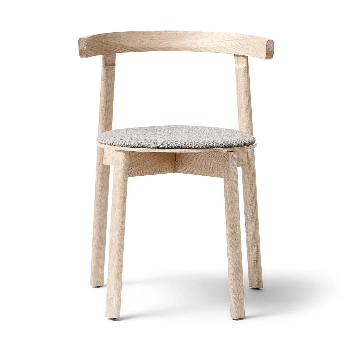 The wooden seat rests on a stable X-shaped construction, which ensures optimum stability and at the same time supports the lightweight appearance. An upholstered seat covered in Kvadrat Hallingdal 65 gives the chair a touch of luxury and offers outstanding comfort.
