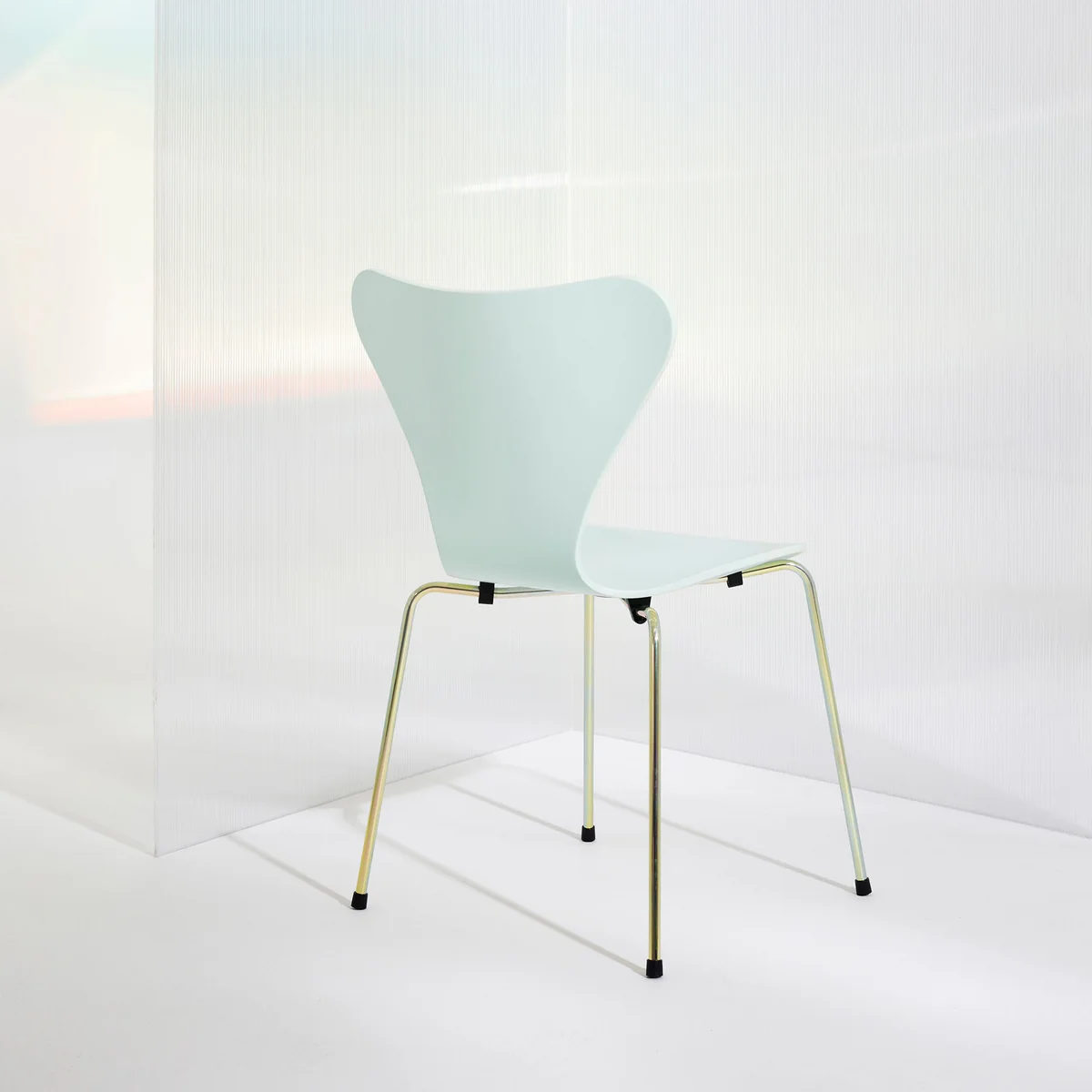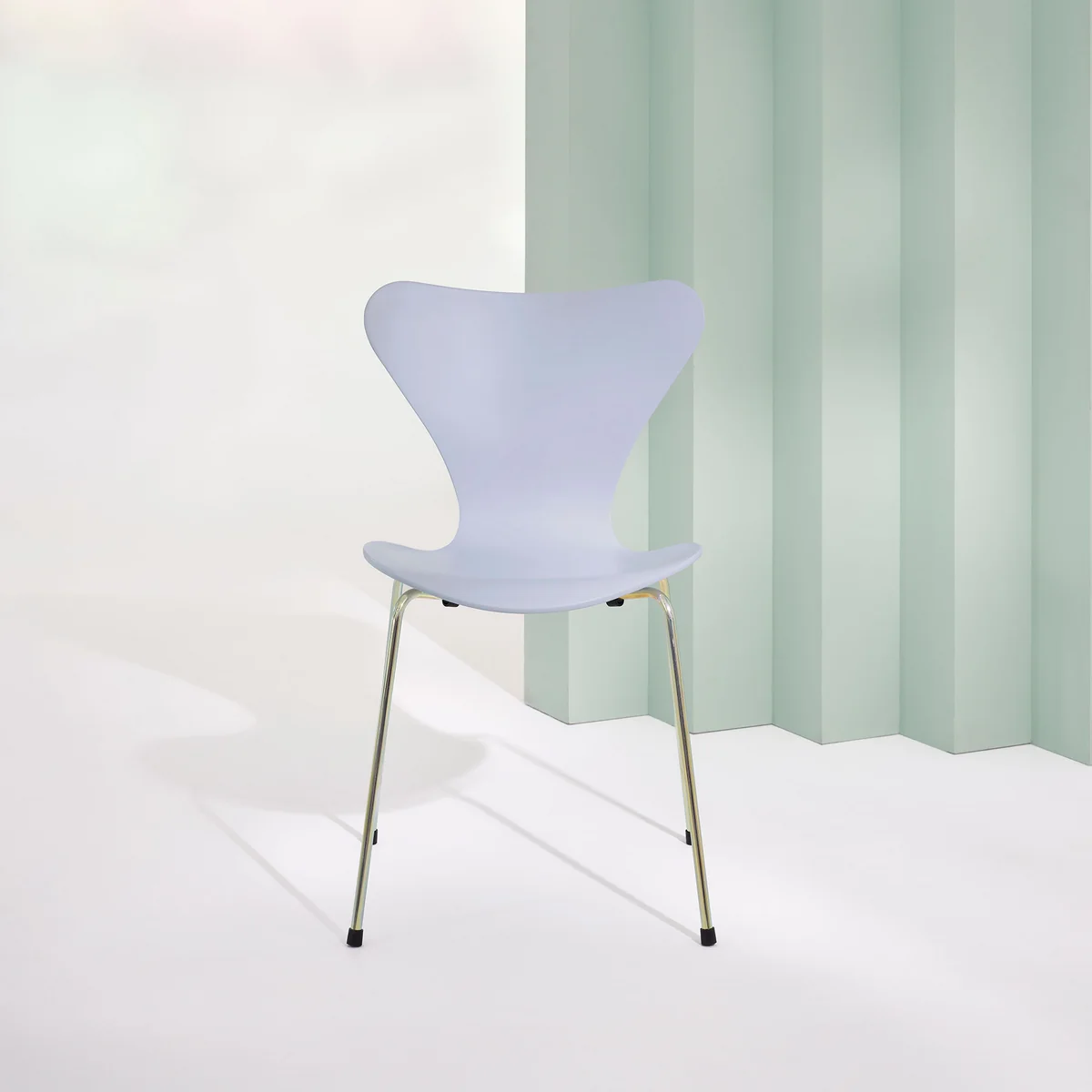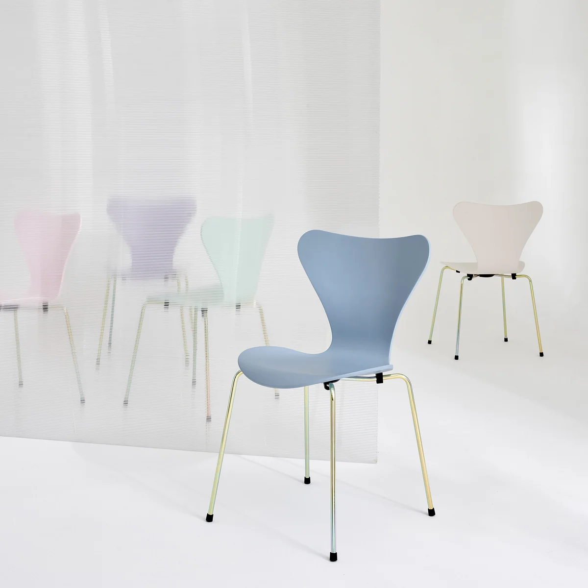 The special edition of this Series 7 chair captures the soft beauty of Danish morning light and gives Arne Jacobsen's iconic Series 7 chair a new, poetic color palette. The five delicate shades (available in green, beige, pink, purple and blue) reflect the colors of an autumnal morning and are combined with a Rainbow frame. These subtle nuances create a calm, harmonious atmosphere and can be easily combined with the existing Fritz Hansen color palette as well as with each other.