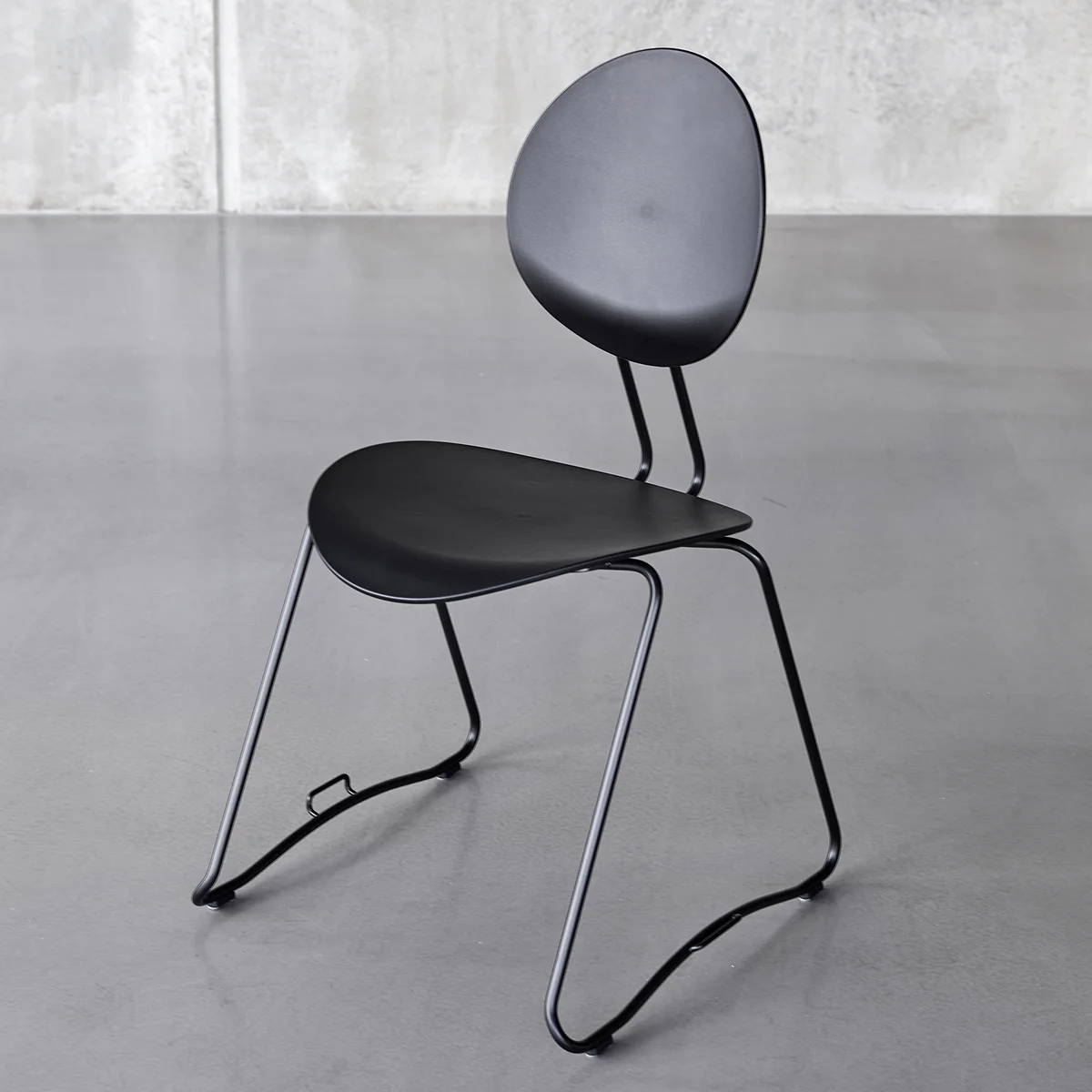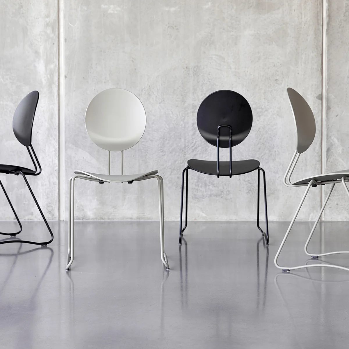 The design of the chair is characterised by a tongue-shaped seat and a gently curved backrest that adapts perfectly to the shape of the body. The seat and backrest are made of 100% recyclable polypropylene (PP), a material known for its pleasant surface, high durability and scratch resistance. The seat is enthroned on a powder-coated skid steel frame that looks particularly filigree.