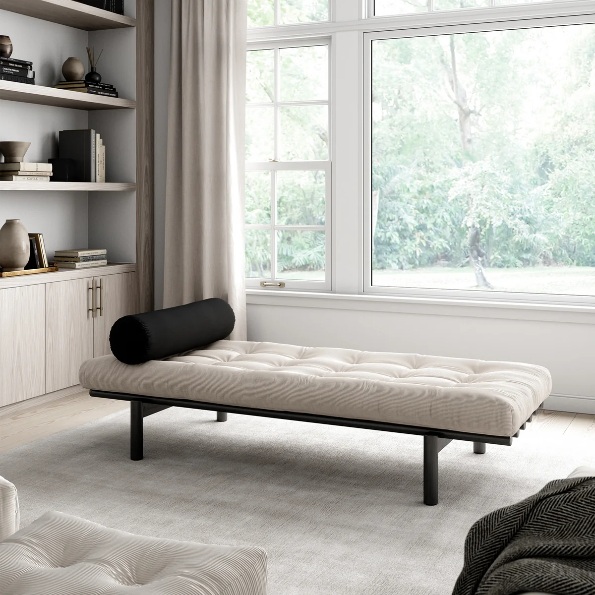 The Next Daybed from Karup Design is a combination of an elegant pine wood frame with a soft corduroy futon mattress and a round cushion on top, adding a modern look to any home. The daybed can serve as a room divider in the living room, entryway, wall, bedroom or anything the imagination can come up with. Flexible and at the same time comfortable, the piece of furniture thus moves with the times and is particularly modern.