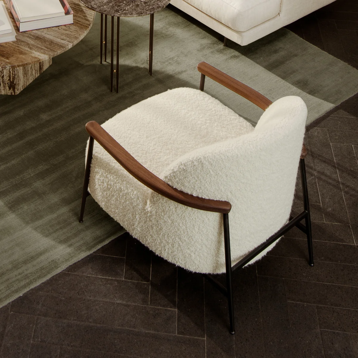 The Sejour Lounge Chair with armrests from Gubi draws its elegance from the skillful play of contrasts: Soft and Hard, Cold and Warm, Massive and Light. The comfortable armchair is incredibly cozy with its deep cushion, but never takes up too much space thanks to its compact dimensions. With its slim armrests and narrow frame, the armchair seems to float in space with lightness. The Danish-Italian designer duo GamFratesi took inspiration from the design of the Victorian Slipper Chair, the classic deep upholstered chair with short legs, and infused it with the Danish design language of the 1950s.