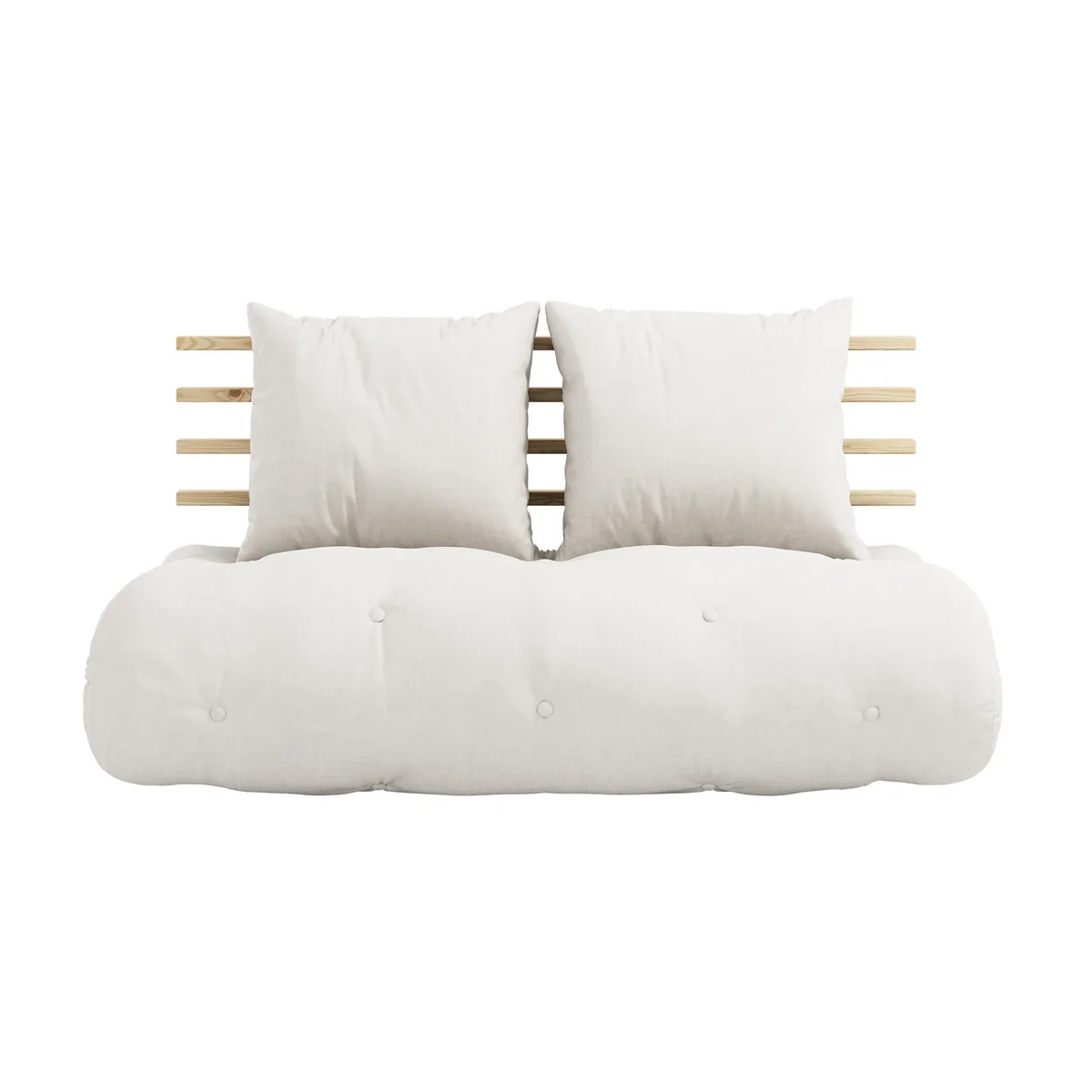 The Shin Sano Sofa from Karup impresses with timeless minimalism and sophisticated features. The sofa features a comfortable, thick futon mattress made of 15 cm recycled blend fiber with a core of 4 cm foam, surrounded by a stylish slatted pine frame on the back. Pull the futon out flat and in seconds you have a nice, large guest bed with a headboard and two comfortable pillows to lean on.