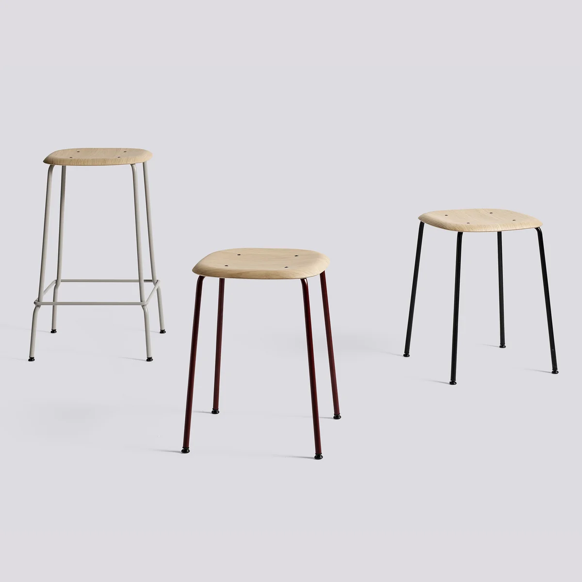 The inviting seat in matt lacquered oak veneer with its strong curves contrasts excitingly with the straight-lined design of the legs. The materials couldn't be more different either, with the legs made from powder-coated steel. They give the stool an industrial flair and make it look good in a wide variety of situations.