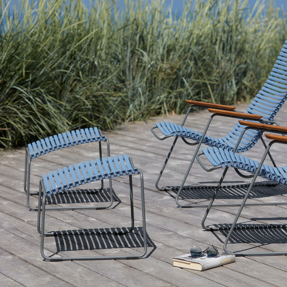 The CLICK outdoor footstool from HOUE was designed to be used in combination with the CLICK Lounge Chair or the CLICK Position Chair to offer an even higher level of seating comfort. The innovative design with interchangeable slats allows you to mix and match the colors as you wish - for ever new accents and individual style. The robust footstool consists of a powder-coated, gray steel frame and a seat made of plastic slats that ensure durability and easy maintenance. Designed by Henrik Pedersen, the CLICK outdoor footstool perfectly rounds off your seating concept and sets modern accents in the outdoor area.