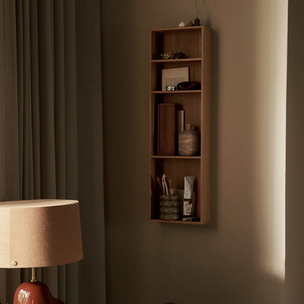 The Bon wall shelf from Ferm Living is the ideal way to store and display your favorite things. The design is inspired by a love of classic craftsmanship. The slim, elegant shelf has detailed joints at the corners and is made from oak veneer with an MDF core. Bon The shelf can be mounted either vertically or horizontally. It can be installed in the kitchen, bathroom or anywhere in the house. If necessary, wipe with a damp cloth and treat with oil.
