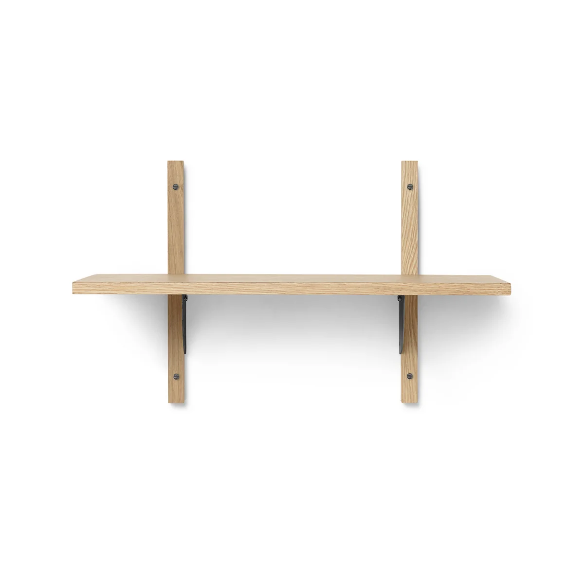 The Sector wall shelf single from Ferm Living is characterised by its robust simplicity and, thanks to its simple appearance, fits into any ambience. Classical straight lines determine the design of the shelf. The boards are made of ash or oak veneer, while the wall mount is made of solid wood. Small details between the elements are made of brass and give the shelf a shiny eye-catcher. The combination of both materials ensures a harmonious overall appearance.