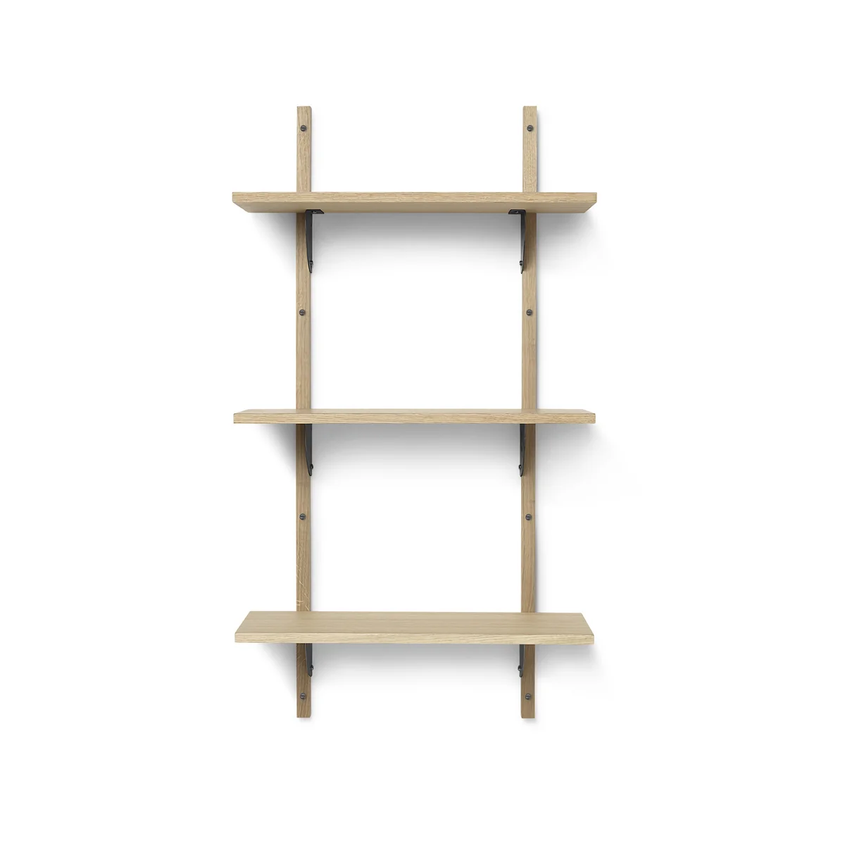 The shelves are made of oak or ash wood, while the wall brackets are made of solid wood. Brass details provide a shiny eye-catcher and make the Sector wall shelf unmistakable. Wall shelving is available in different lengths and colours.