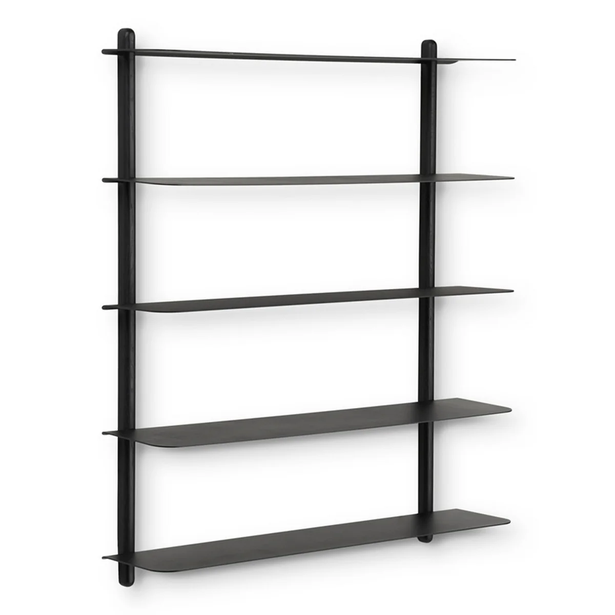 What is special about the shelf is that there are no visible screws. The shelves are smoothly inserted into the wooden rods, which are slotted for a perfect fit. This creates a floating impression that gives the shelf a certain lightness.
