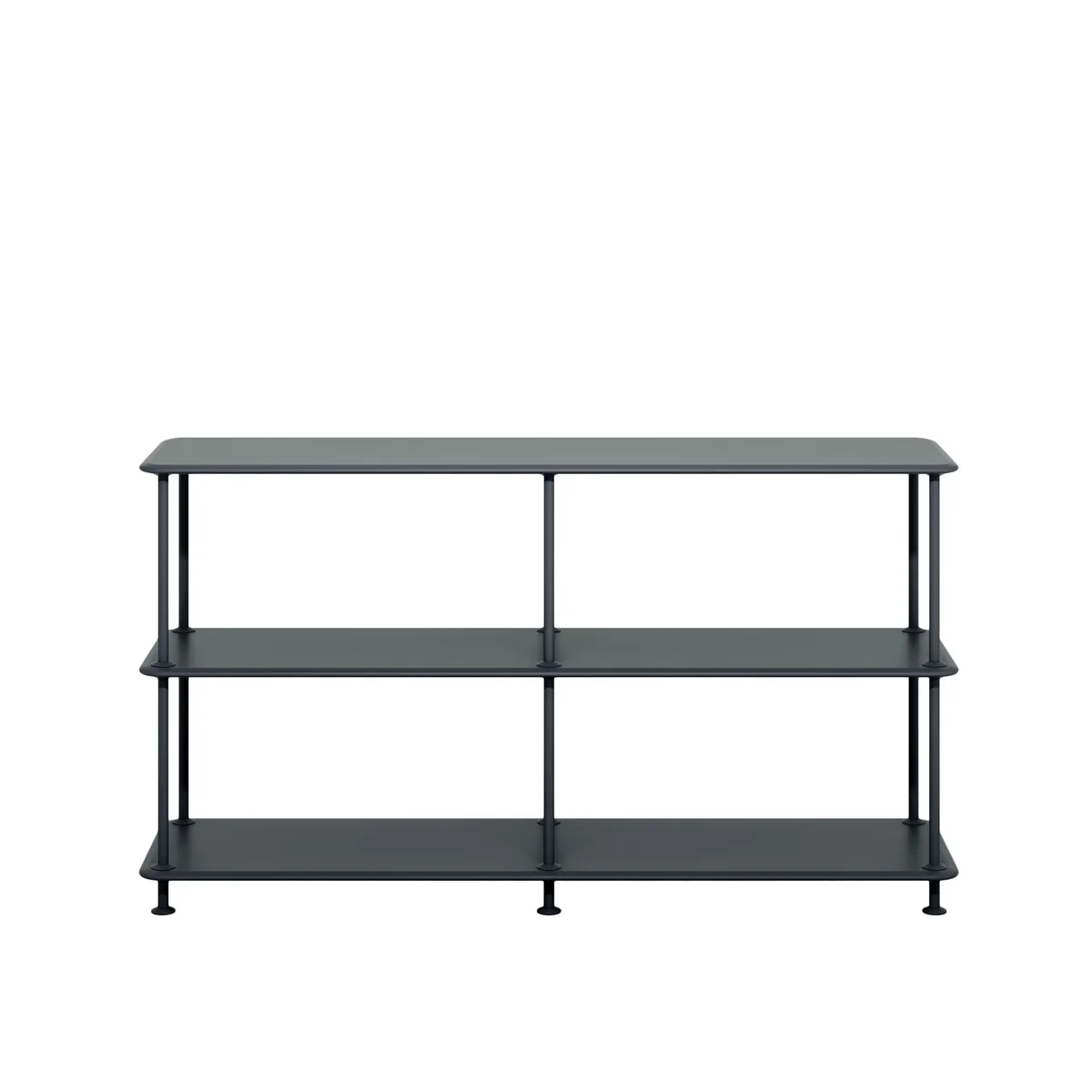 The shelves are made of lacquered 16 mm MDF board. Strong columns of powder-coated metal hold the shelf together. The feet are height adjustable and equipped with soft plastic glides. The floor is thus protected from the metal and the shelf is placed in a non-slip position. The shelf can be supplemented with textile panels of your choice, which can be clicked between the columns, thus playing with open and closed elements in the room.