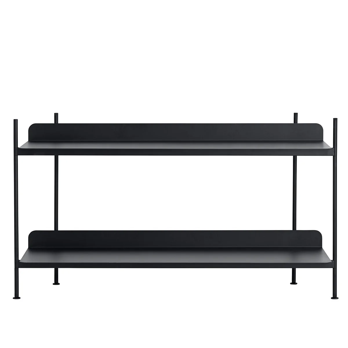 The Compile is the modern version of the classic shelving system. One shelf level consists of one shelf board and two tube constructions, which are available in three different heights. This way you can determine for each level individually, how much distance there has to be to the next shelf.