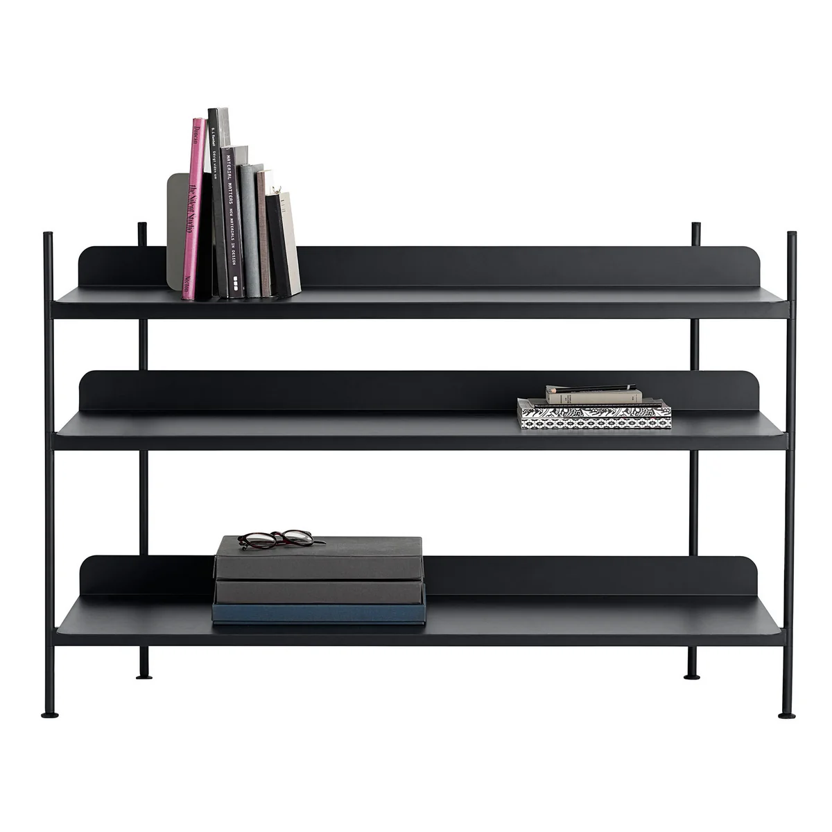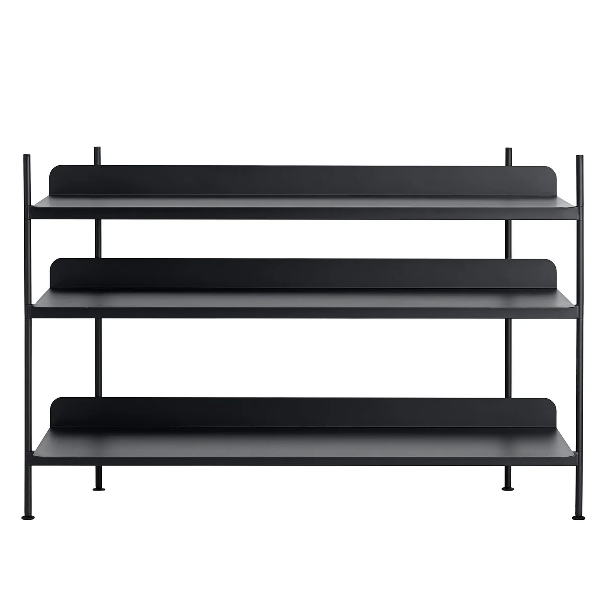 The Compile is the modern version of the classic shelving system. One shelf level consists of one shelf board and two tube constructions, which are available in three different heights. This way you can determine for each level individually, how much distance there has to be to the next shelf.
