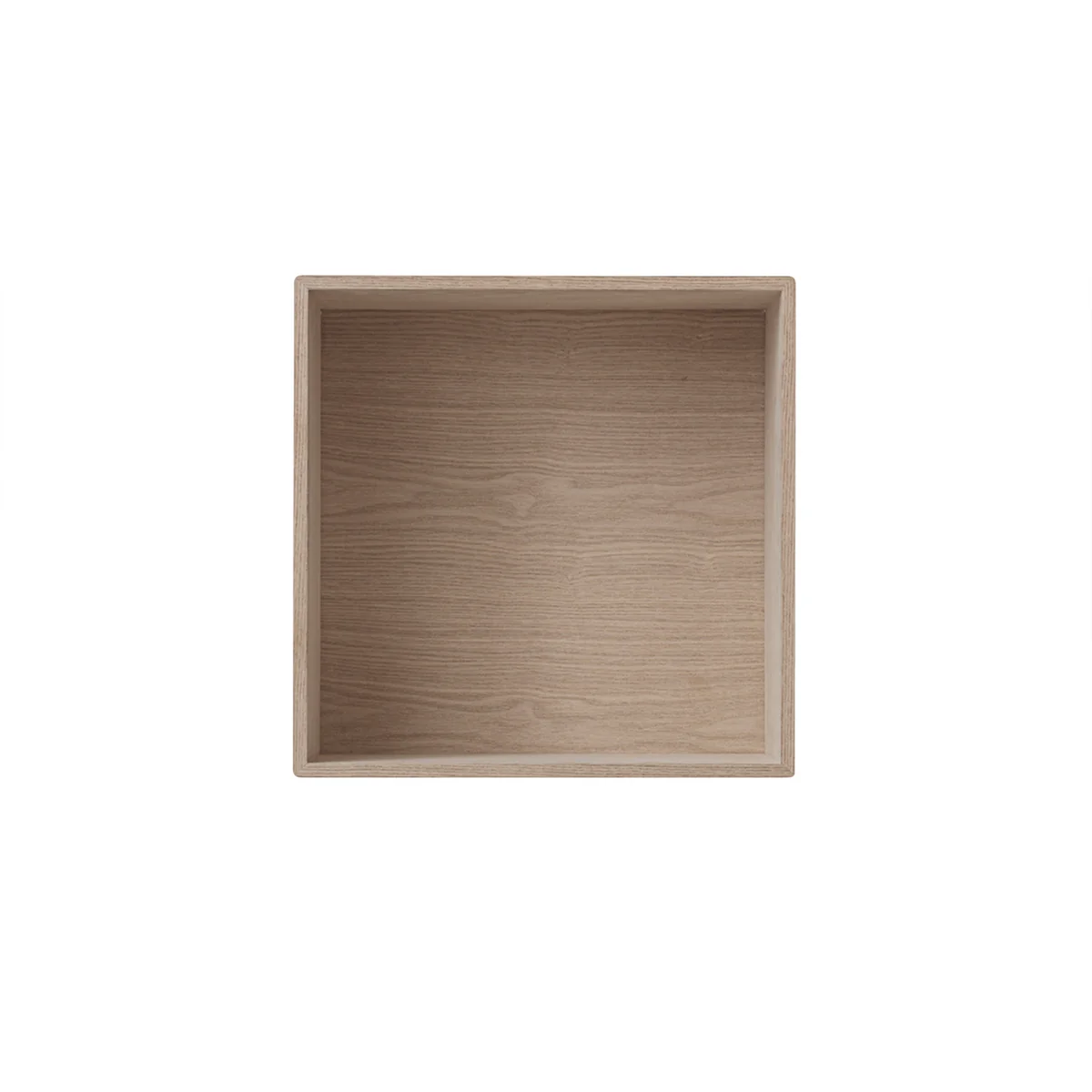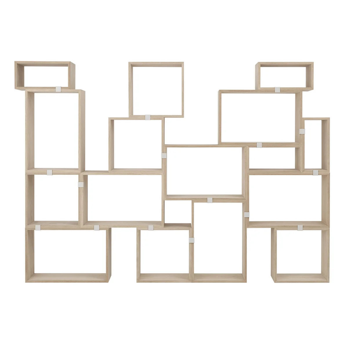 The modules of the Mini Stacked shelving system are made of MDF with oak veneer. They are available in different sizes and with a back panel in different colours. Due to the variety of modules the Mini Stacked shelving system can be put together individually and adapts perfectly to any taste and any room situation.