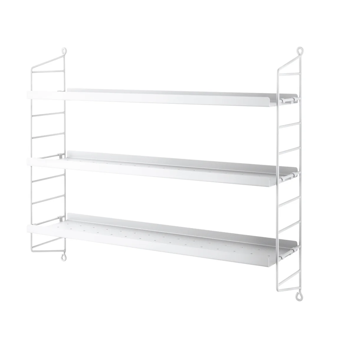The String Pocket shelf can be combined with other shelves and can be extended both upwards and sideways. Floor ladders are not available for this shelf. The scope of delivery includes two side elements for wall mounting and three matching shelves.
