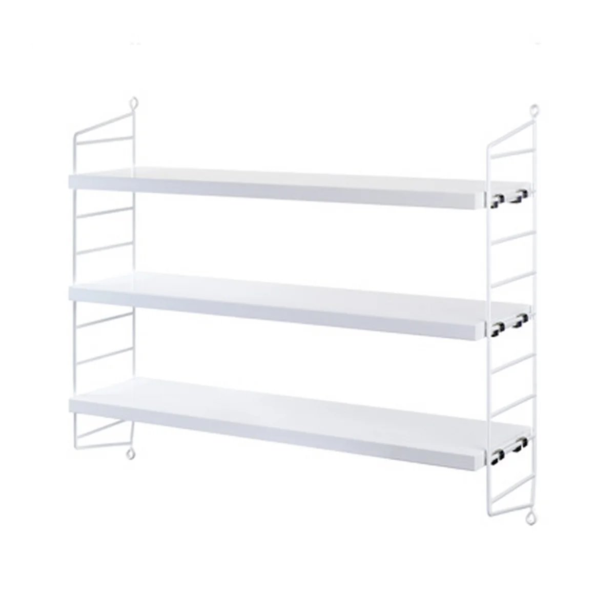 The String Pocket shelf from Nisse Strinning can be combined with other shelves and can be extended both upwards and sideways. Floor ladders are not available for this shelving unit. The scope of delivery includes two side elements for wall mounting and three matching shelves.