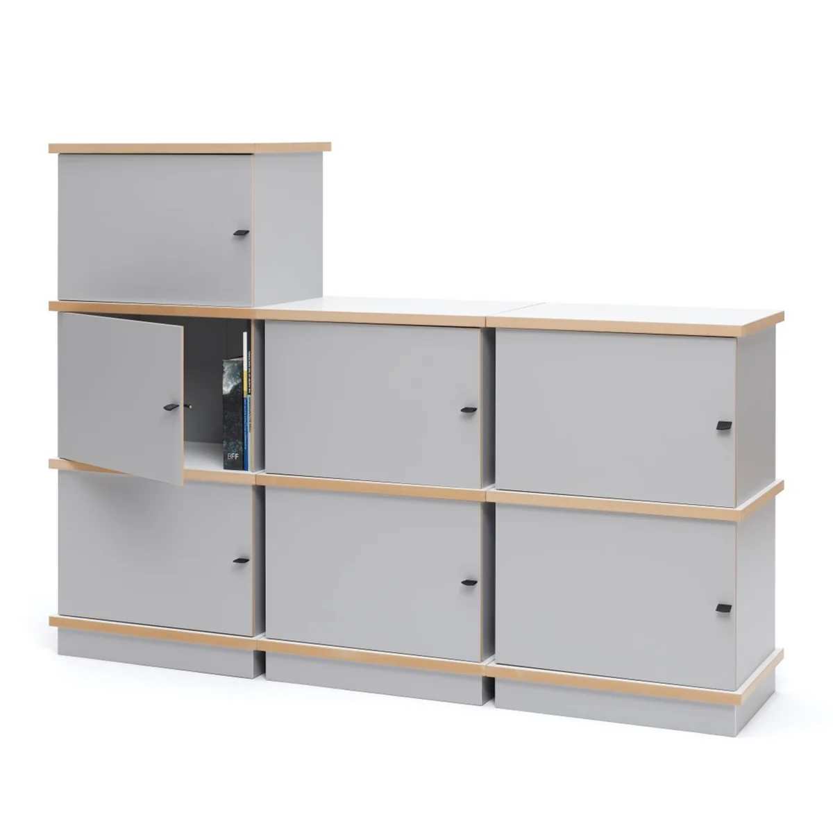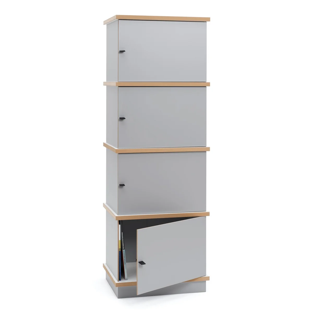 The Tojo Stap is a modular system of boxes from the German Design Studio eigenwert, whose box elements can be easily combined. The door is connected the side walls of the box and can be opened and closed by being folded like a sheet of paper. The side walls’ are connected to the shelf boards by simply being stuck inside the board’s grooves, like that the construction of the modular shelving system does completely without screws.