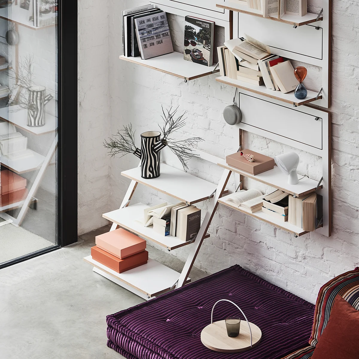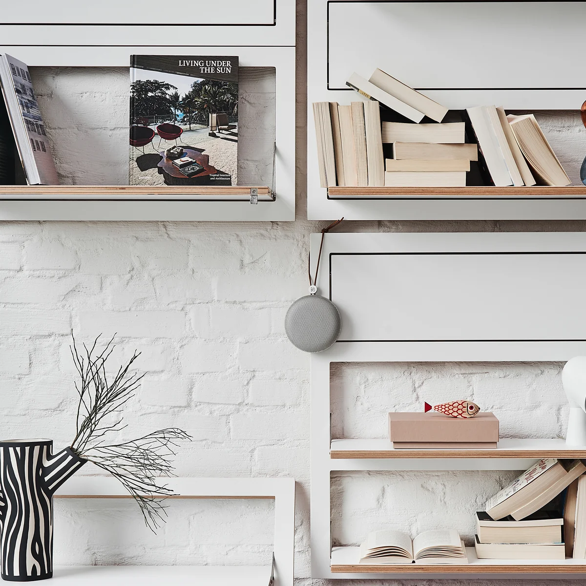 All shelves can be combined with each other and with the other furniture of the Fläpps series. Together they can create an individually designed wall that takes up no space when folded and is a real space miracle when unfolded.