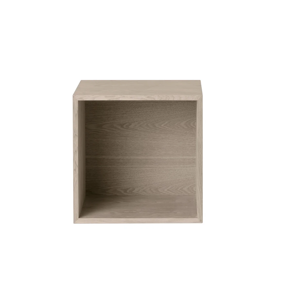 The Stacked shelving system modules made of MDF with oak veneer are available in various sizes and with or without a back panel. They are assembled stably and firmly with the help of the Stacked clamps and are flexible and changeable in shape. All modules with a back panel can be mounted on the wall. The individual shelf becomes particularly beautiful together with the Stacked modules in different colours and with the modules of the Mini Stacked series.