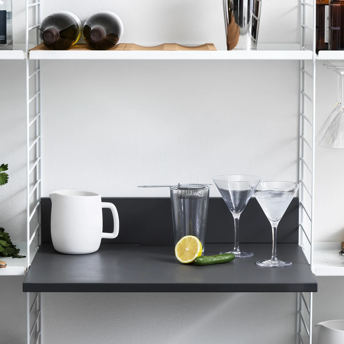 The media shelf from String is the ideal storage for stereo systems, CD players and record players: the player can be placed on the flat shelf. On the wall side there is a recess through which the cables can be pulled. In this way, the sound system can be presented elegantly and without annoying cable chaos. The media shelf, like everything else on the Pocket shelf from String , is not just limited to this purpose - it can also be used in the living room as a coffee table or in the bedroom as a decorative surface. It was designed by - Anna von Schewen and Björn Dahlström.