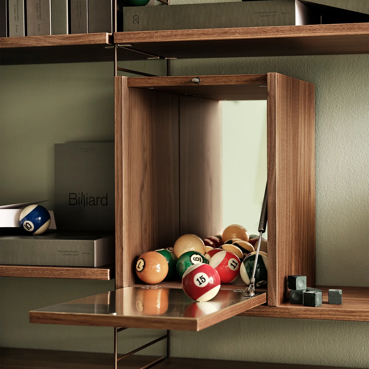The cabinet element from String is made from veneered MDF, mirror glass and stainless steel. The product is made from recyclable materials.
