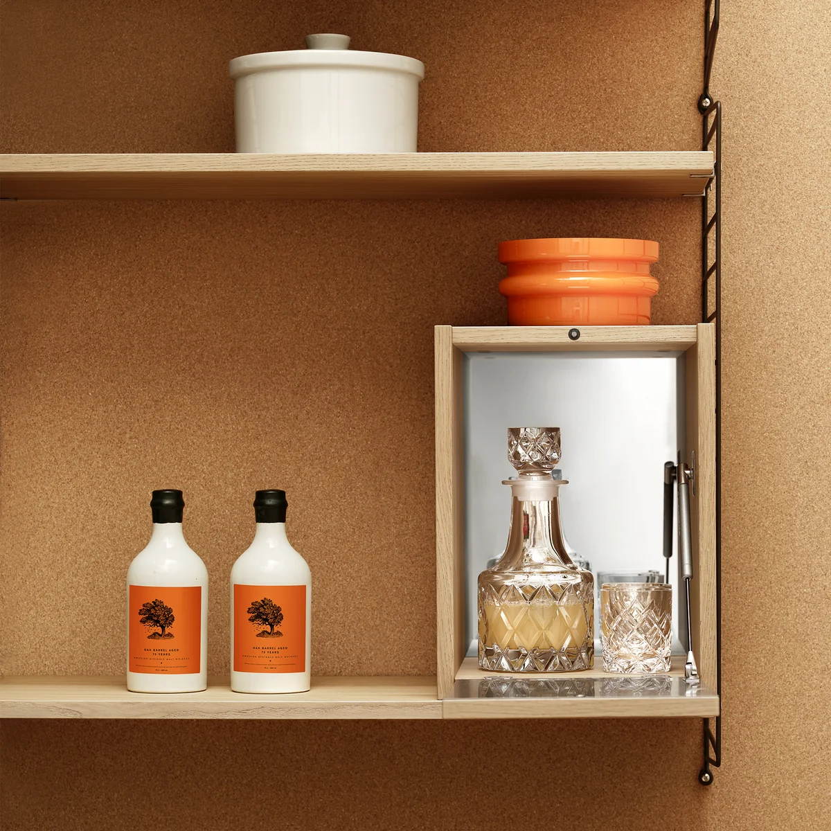 The small cupboard element by Nisse and Kajsa Strinning for the manufacturer String can be used as desired. It is available in the dimensions (W x D x H) 28 x 30 x 38 cm. Wire panels 30 cm deep can be integrated into the cabinet. The cabinet element is suitable for placing on a wooden shelf or another of the available cabinets from String . The element must be attached to one of the existing wire panels. The inside of the top of the cabinet is covered with a brushed stainless steel panel. The inner rear wall is fitted with a mirrored panel.