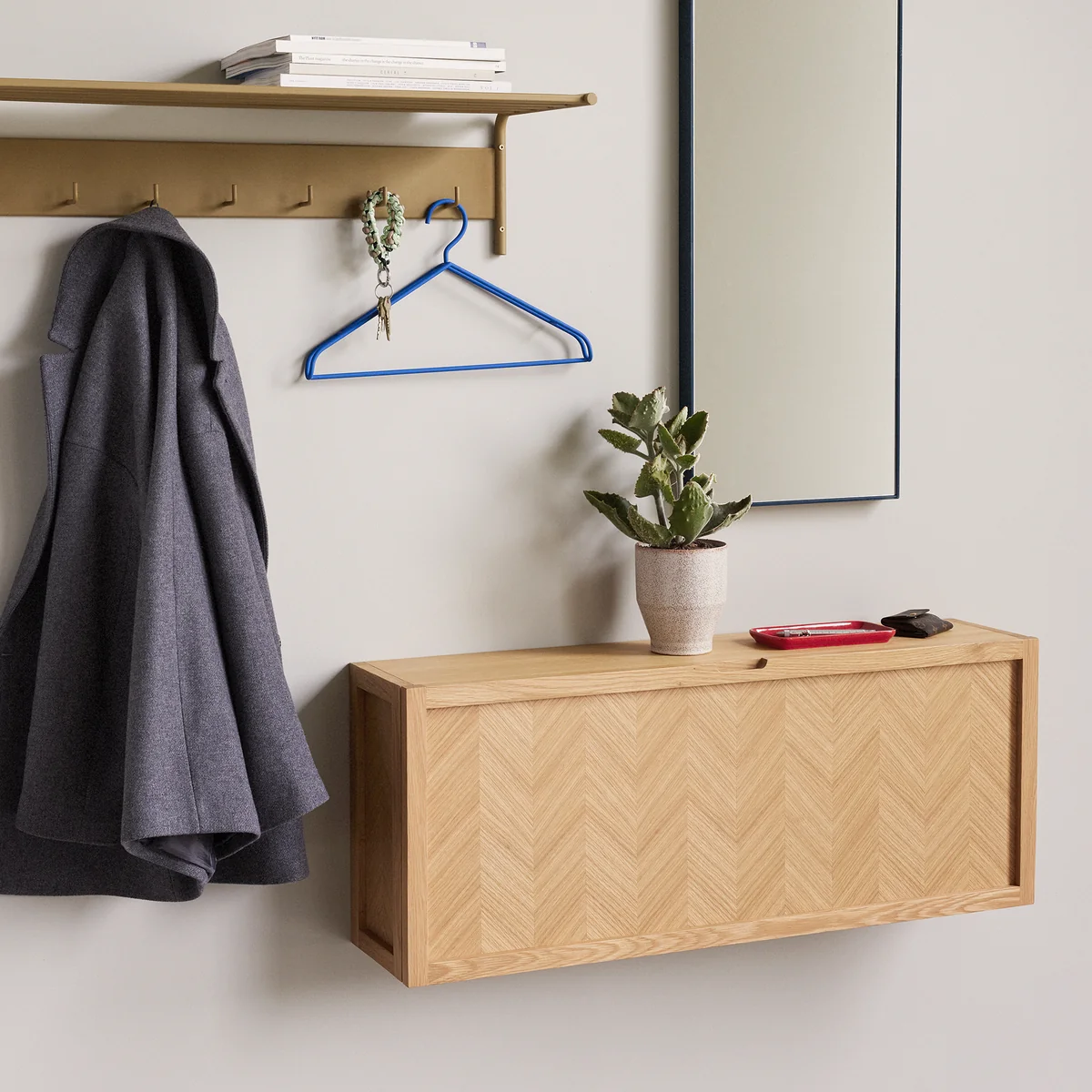 The Herringbone Shoe cabinet from the Danish manufacturer Hübsch Interior is exceedingly stylish with its herringbone pattern. The large wall shoe cabinet is made of FSC®-certified oak veneer. Sneakers, pumps, boots and co will find ample storage space. Herringbone Can be wonderfully placed in the hallway or entrance area.
