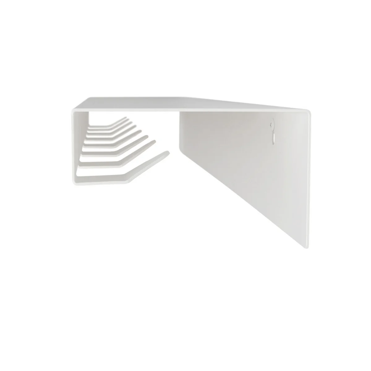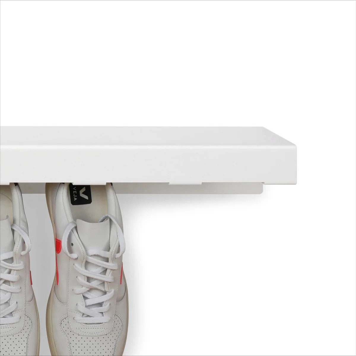 The shoe rack Hang On of the label vonbox inspires with its simple functionality. The minimalist wall shelf is equipped with hooks on the bottom, on which up to four pairs of shoes can be easily hung. Hang On is made of powder-coated steel and offers enough space on the top for small decorative objects, baskets and Co. Screws and dowels are included.