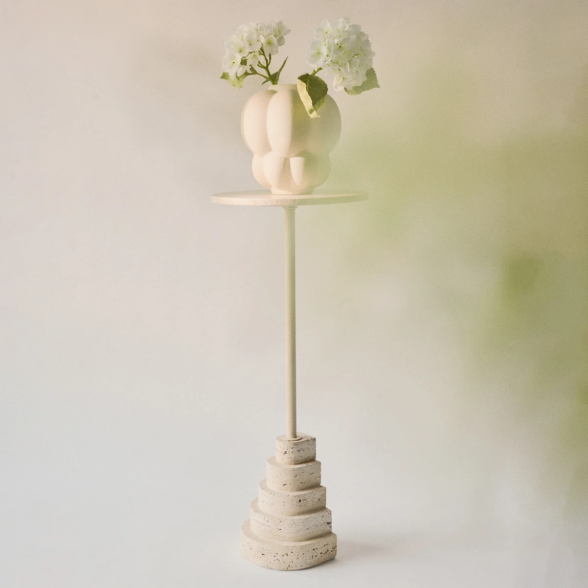 The Solum side table from AYTM is characterized by its elegant and high-quality appearance, which fits perfectly into any ambience. The base of the table is formed by a travertine plinth in a graphic design, which ensures stability and a robust look. The round table top sits enthroned on it, connected by a filigree bar.