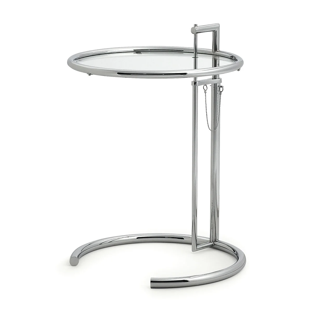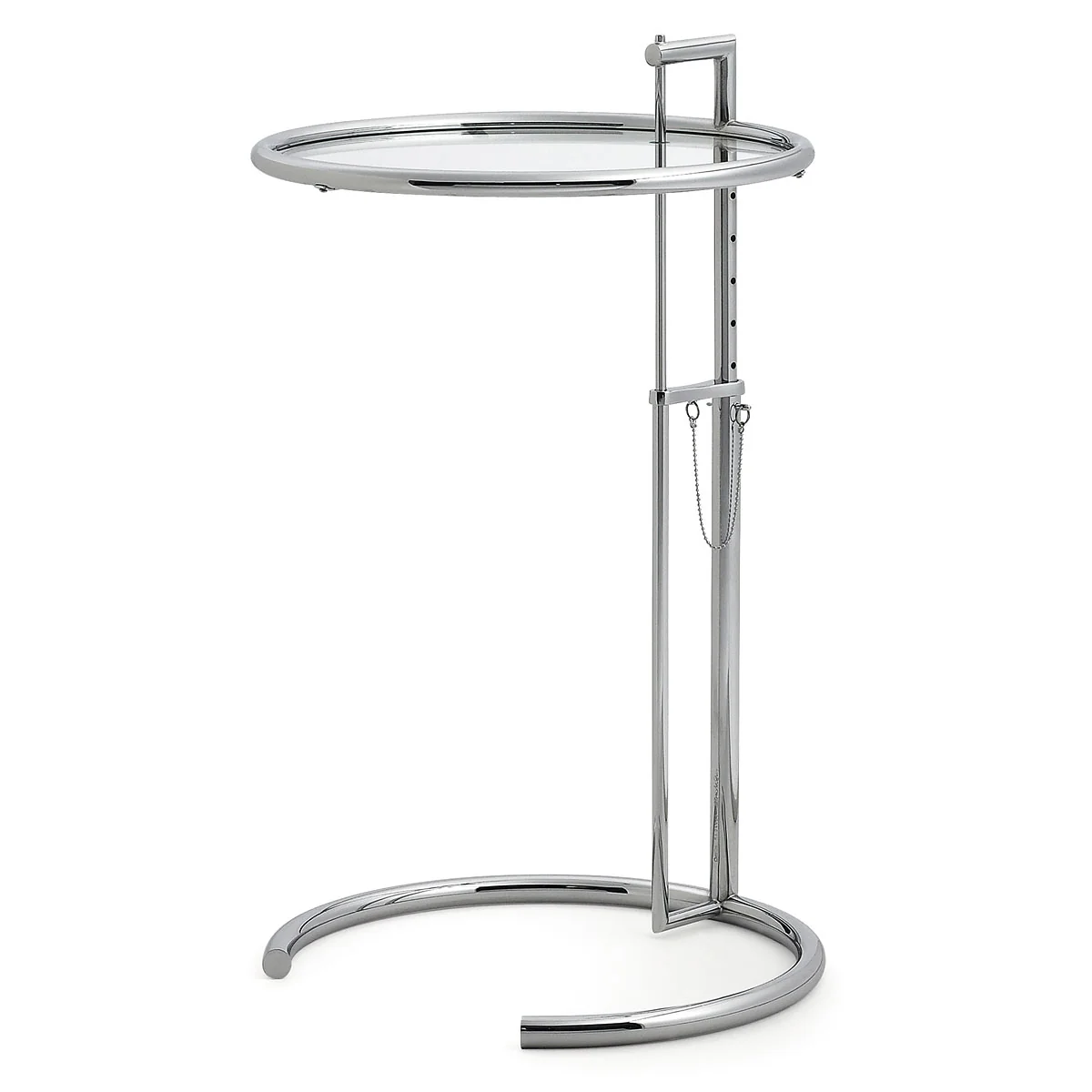 The height-adjustable frame of the side table is made of chromed tubular steel. The classic version has a clear crystal glass top. Furthermore, the Adjustable Table is also available with a grey Parsol glass top or a black lacquered metal top.