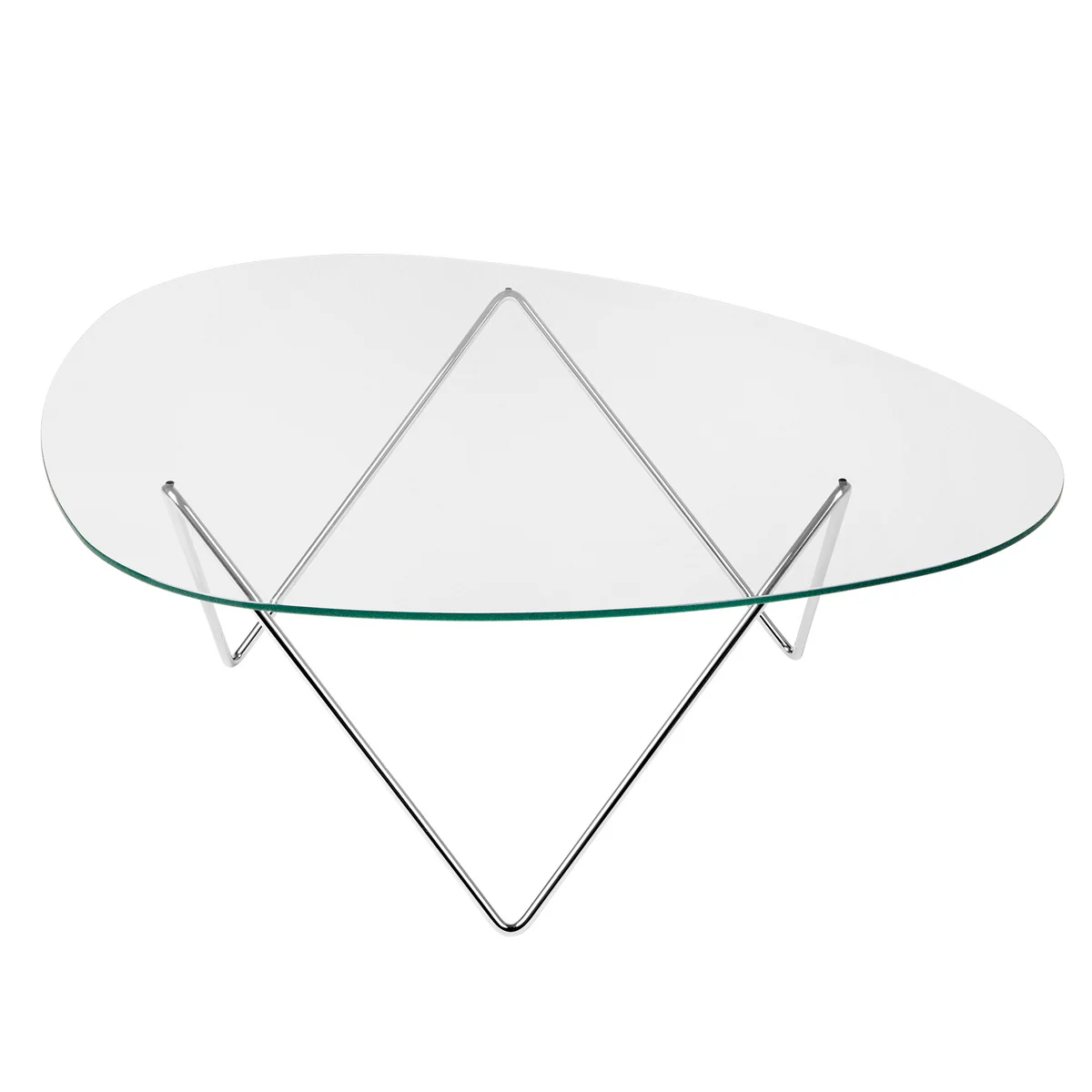 Thanks to the broad-based Pedrera project, Barba Corsini gained international recognition at the time and the furniture advanced to become design classics. The Pedrera side table is made by Gubi with a metal base and has an organically shaped glass top.