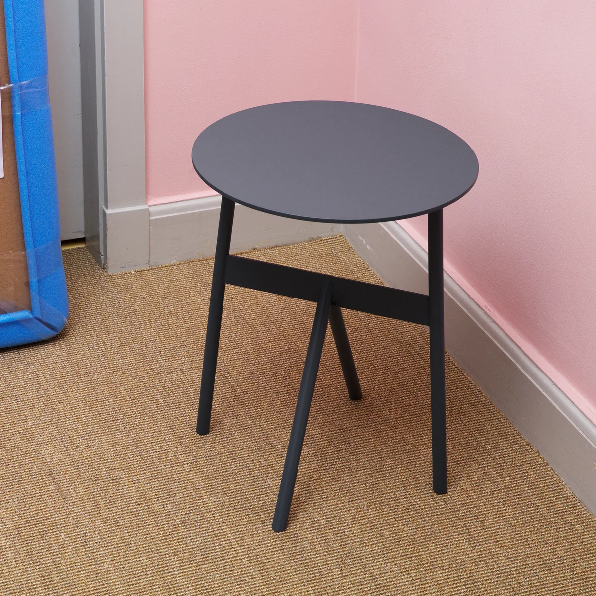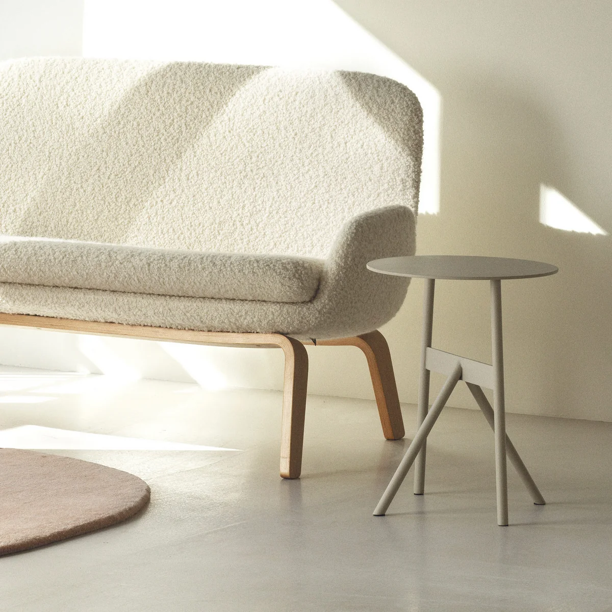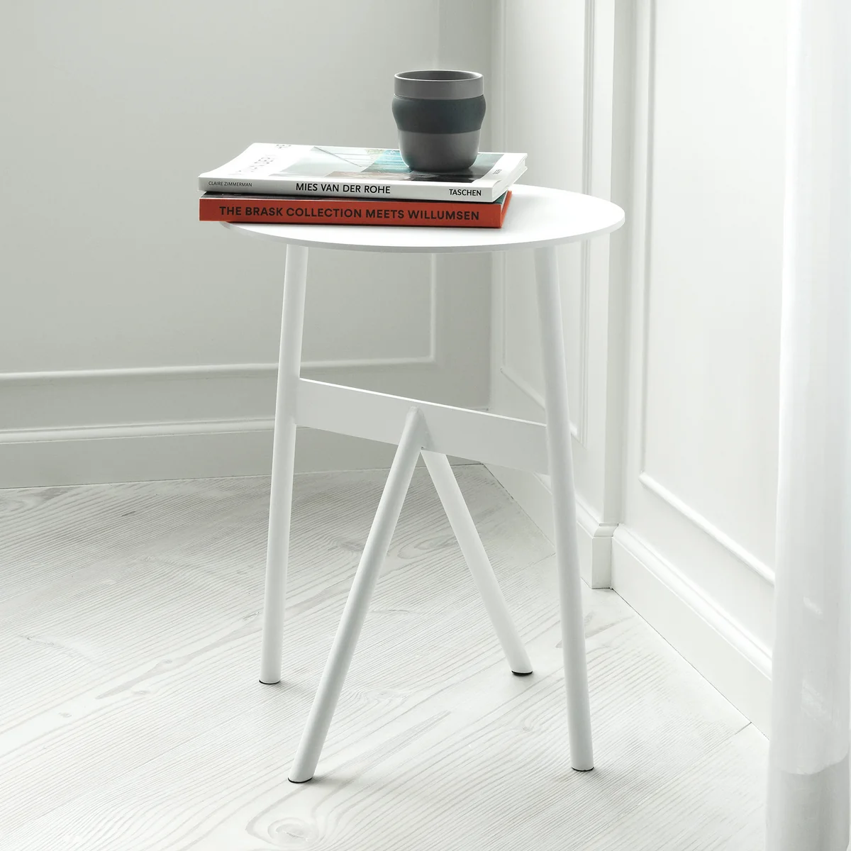 The side table gets its special character from its unconventionally shaped table legs, which emphasize the strength of the material. The angled legs as well as the hollow space between the round table top and the triangle of the legs create a harmonious symmetry, which makes the table an eye-catcher in any room.