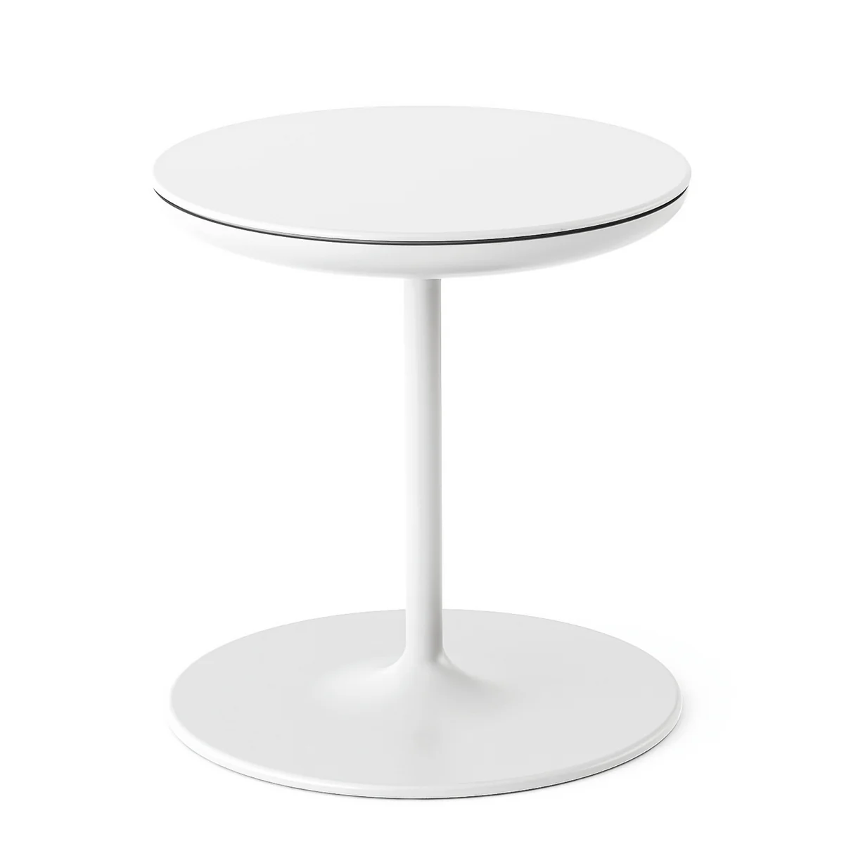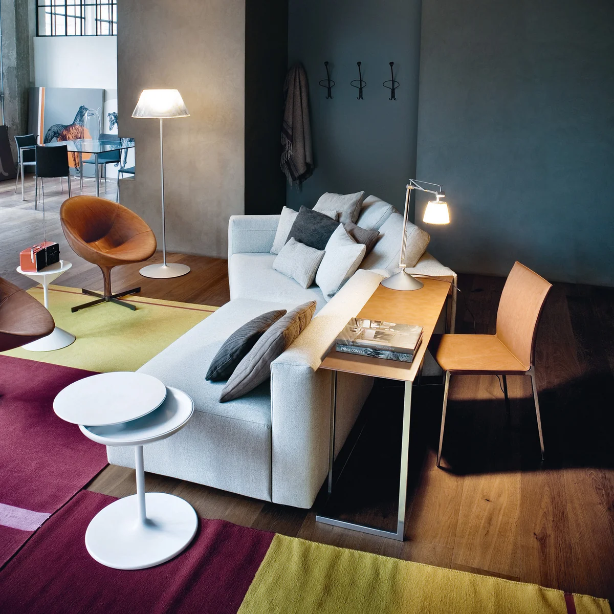 The awarded Toi side table by Zanotta was designed in a noble, simple appearance and it is especially striking by its multiple curves and the round, removable tabletop. This one can be opened and closed by means of the storage compartment below.
