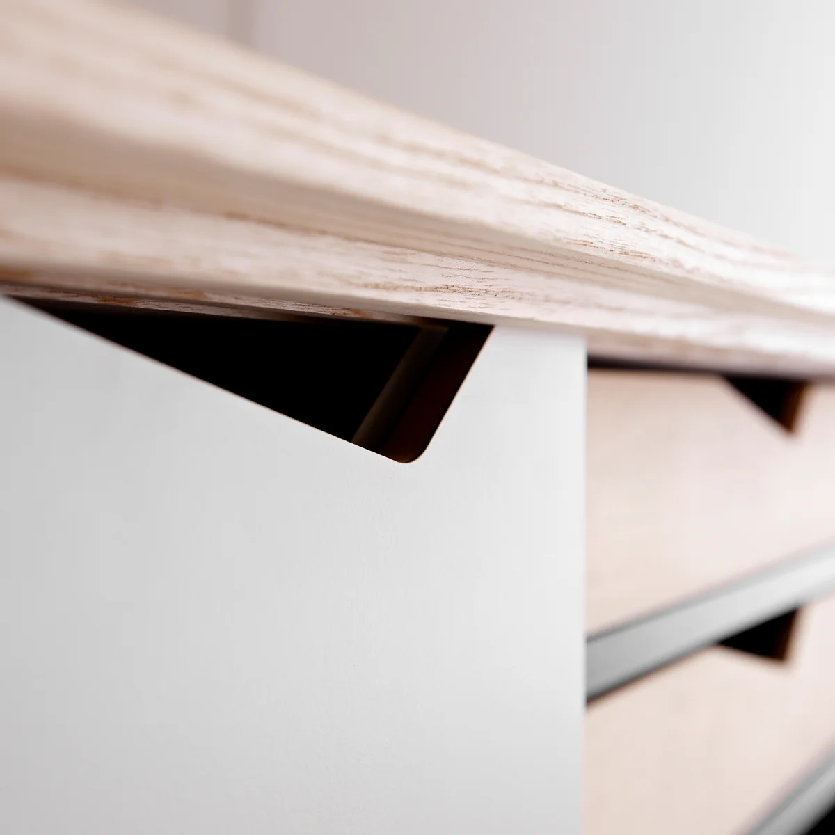 For the body of the dresser you can choose between solid ash, oak or walnut and the doors are available in nine different colors. The doors are lacquered in two colors. On the one hand they convince with the selected desired color and on the other hand they are timeless black lacquered. Depending on your preference, you can then decide which color should adorn the front of the chest of drawers.