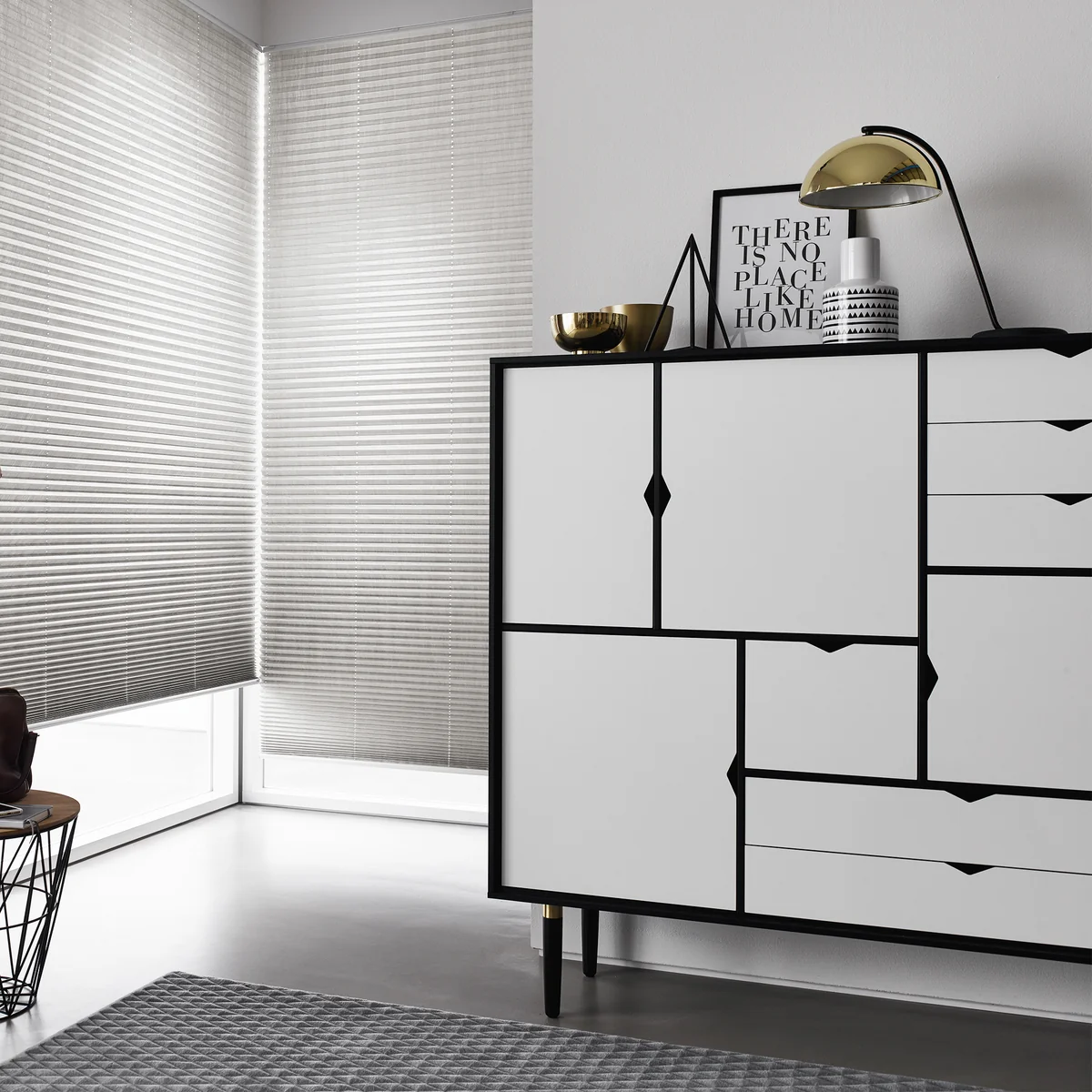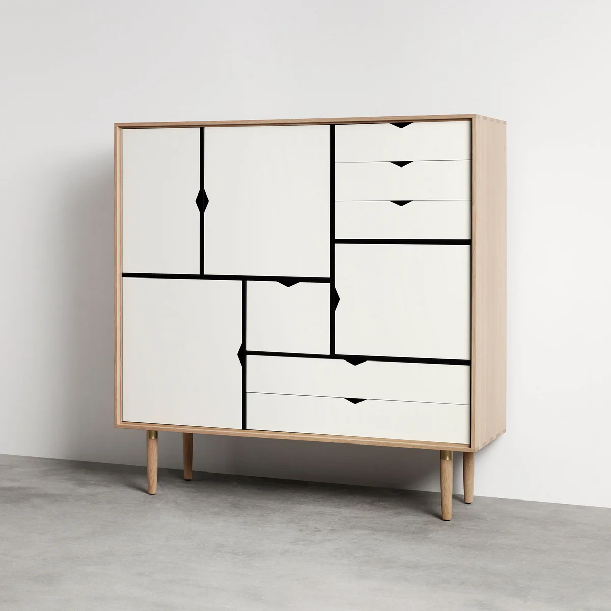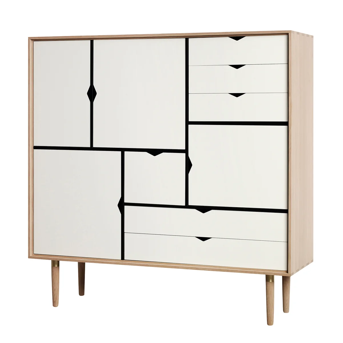 S3 is made of solid oak in oiled, soaped or black lacquered or solid oiled walnut with mortise and tenon joints and has turned feet with brass finish. The monochrome version of S3 has drawer fronts and doors in a plain white. S3 However, there is also a multi-coloured version. The fronts of the multi-coloured version are in silver, beige and metallic grey. The backs and dividers are black in each version.