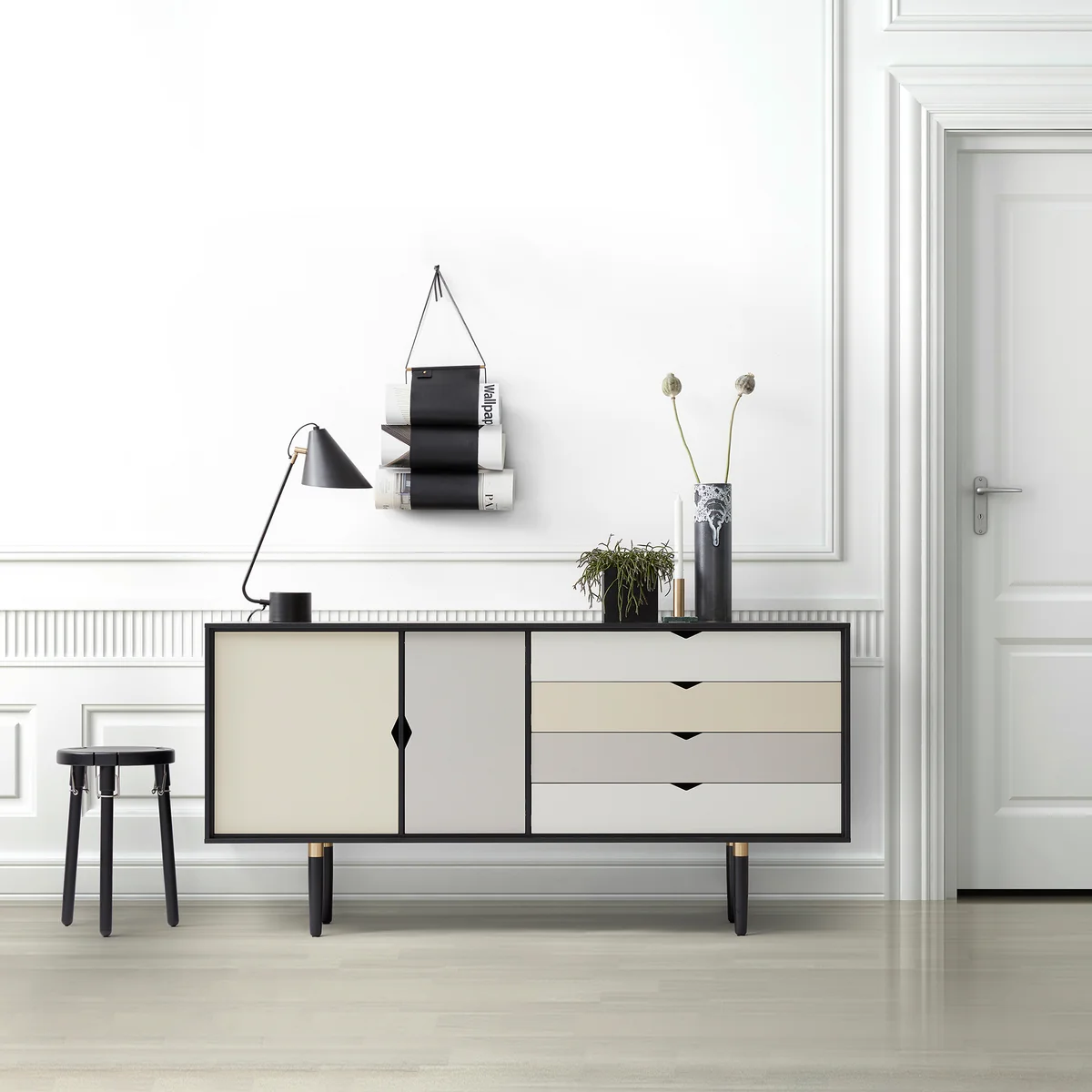 S6 Is made of solid oak in oiled, soaped or black lacquered or solid oiled walnut with mortise and tenon joints and has turned feet with brass finish. The multi-colored version of S6 features drawer fronts and doors in silver, metallic gray and beige, but S6 also comes in a single-color version. This one impresses with a plain white on drawers and doors. The backs and dividers are black in each version.