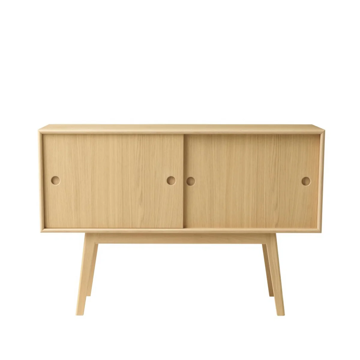 The A83 Butler sideboard is part of the Butler series from FDB Møbler , which was designed by the designer duo Foersom & Hiort-Lorenzen. The simple Scandinavian design convinces with wooden legs that lift the body of the sideboard into the air. Depending on the variant, the doors are in contrasting colours or natural. Through small round recesses, the sliding doors can be easily slid to the left and right. Behind it, all kinds of small things can be stored, which should not be discovered at first sight. The sideboard from the Butler series is wonderfully suitable for the living room or the hallway, where it fits harmoniously into the interior.