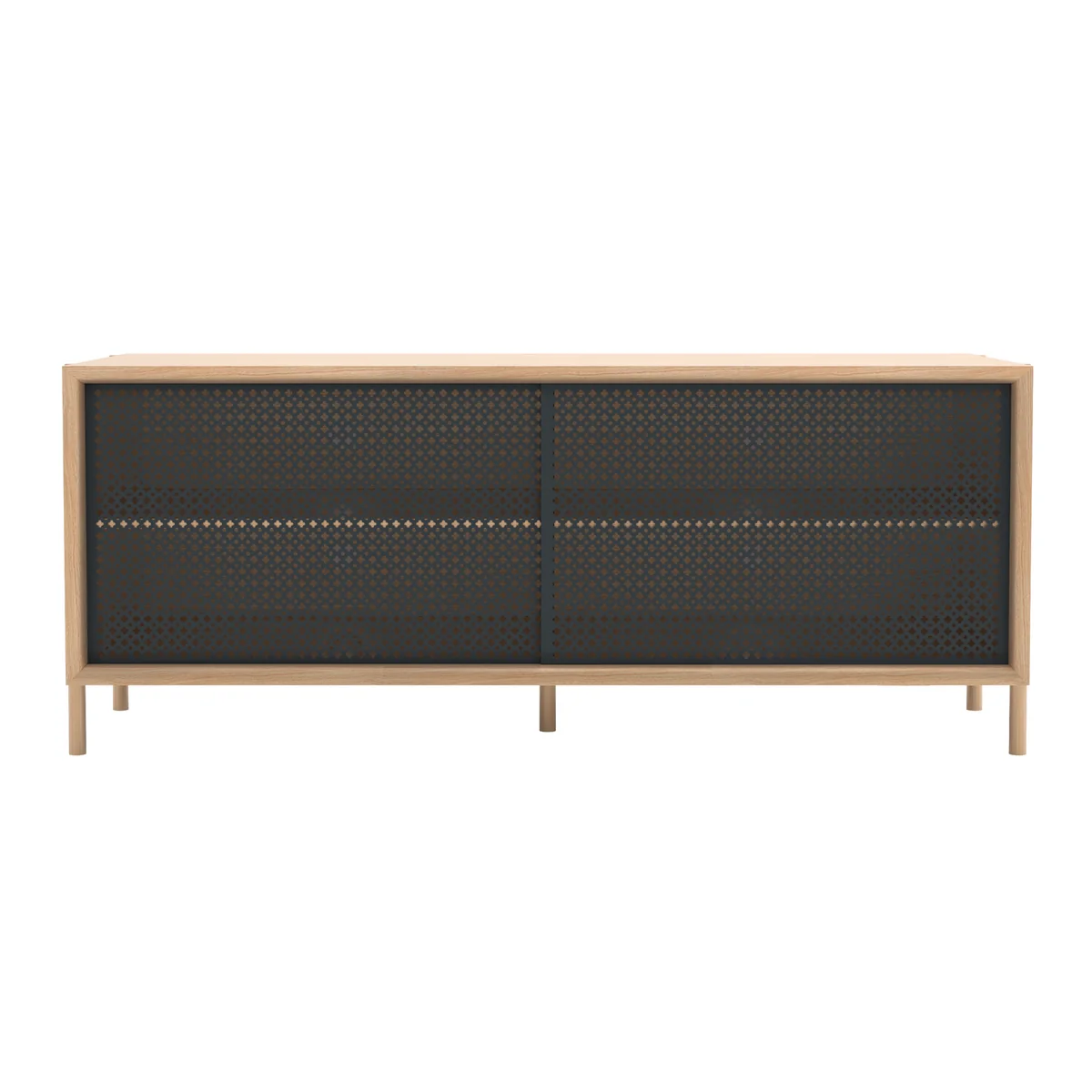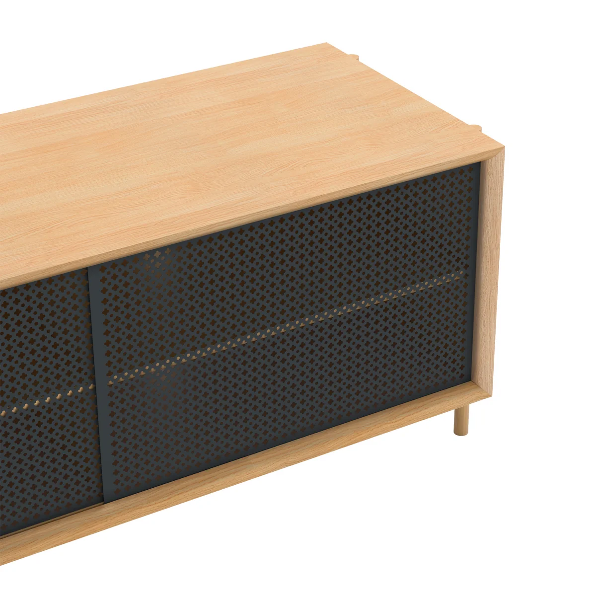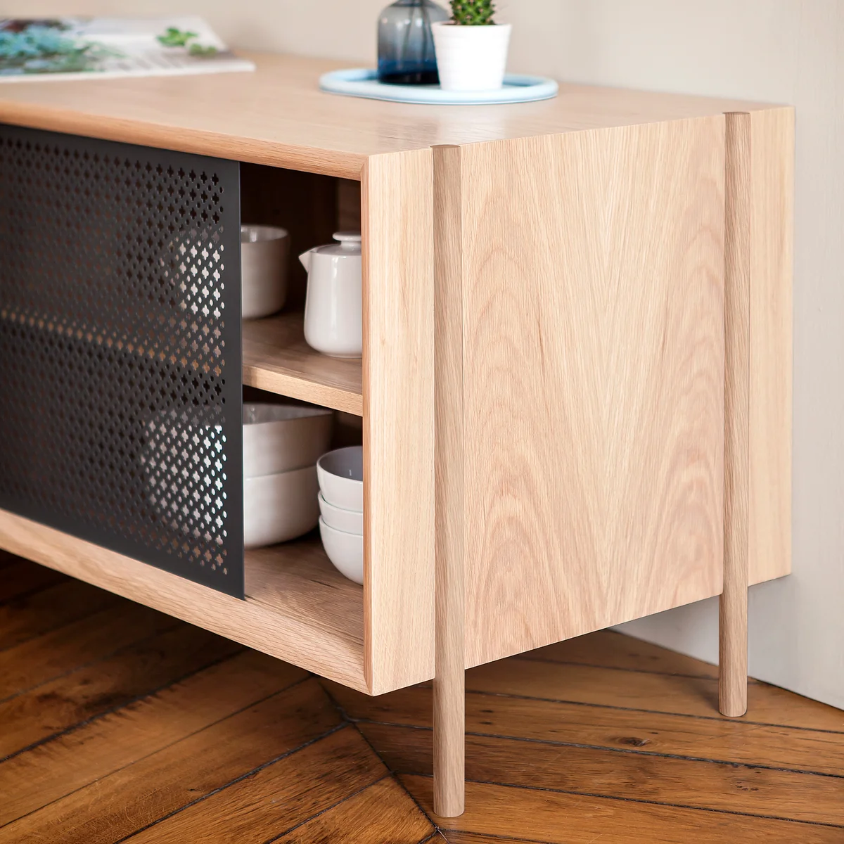 The Gabin Sideboard from the French manufacturer Hartô is characterized by its harmonious mix of materials and detailed design. The body of the sideboard is made of MDF panels with high-quality oak or walnut wood, while the sliding doors are made of steel. These have filigree perforations reminiscent of the art of basket weaving.