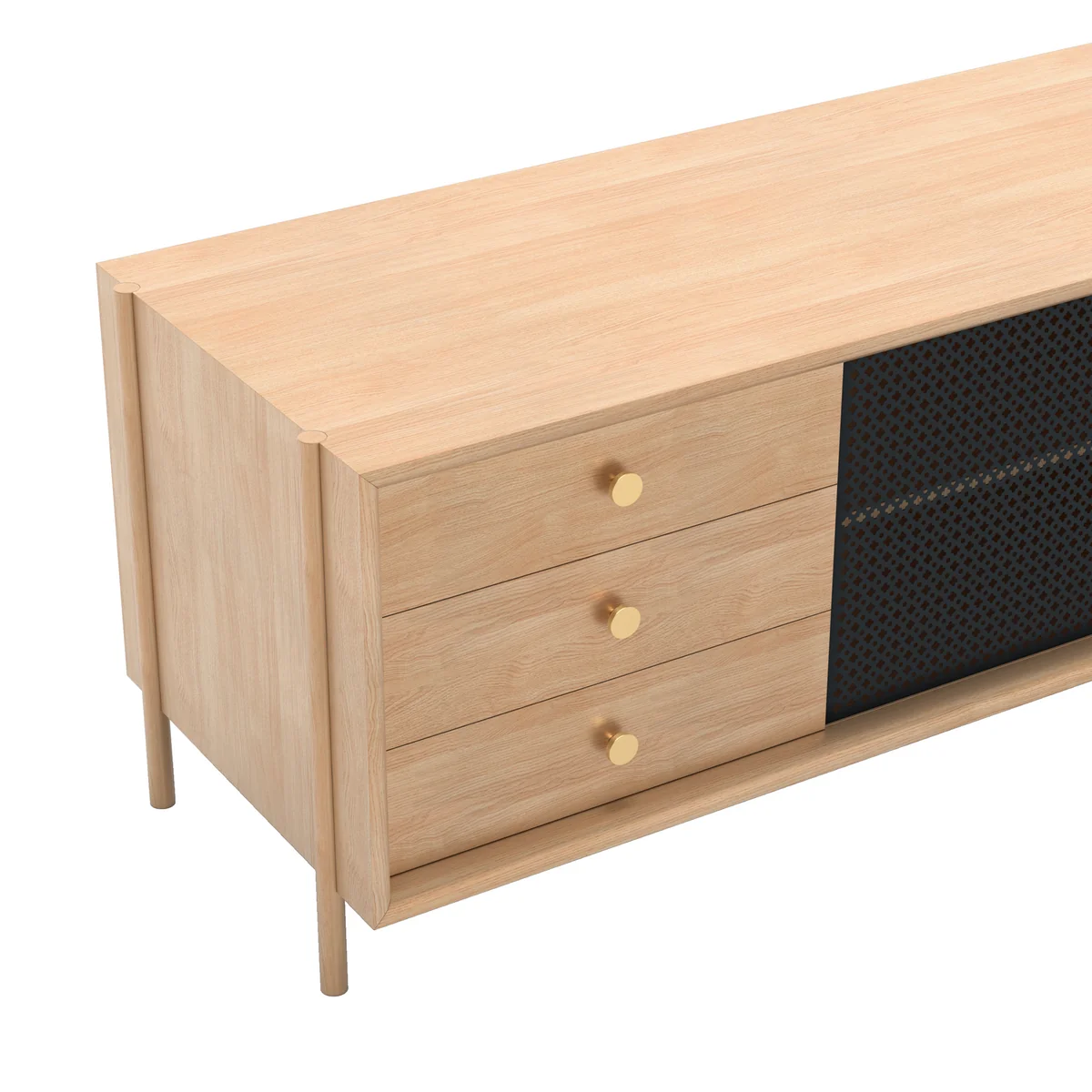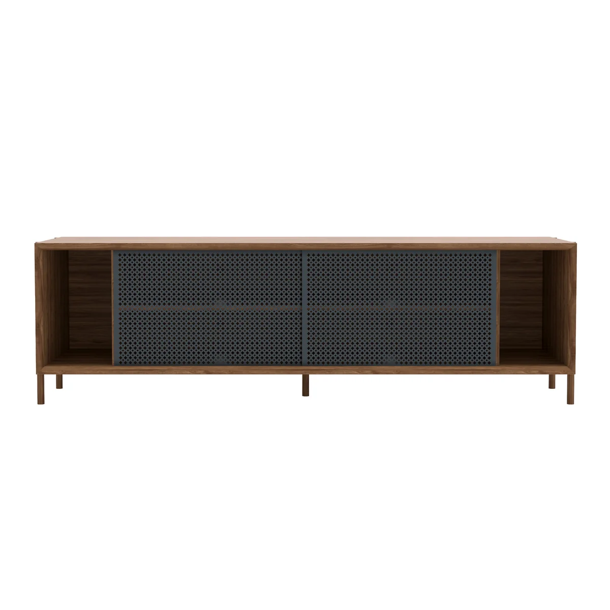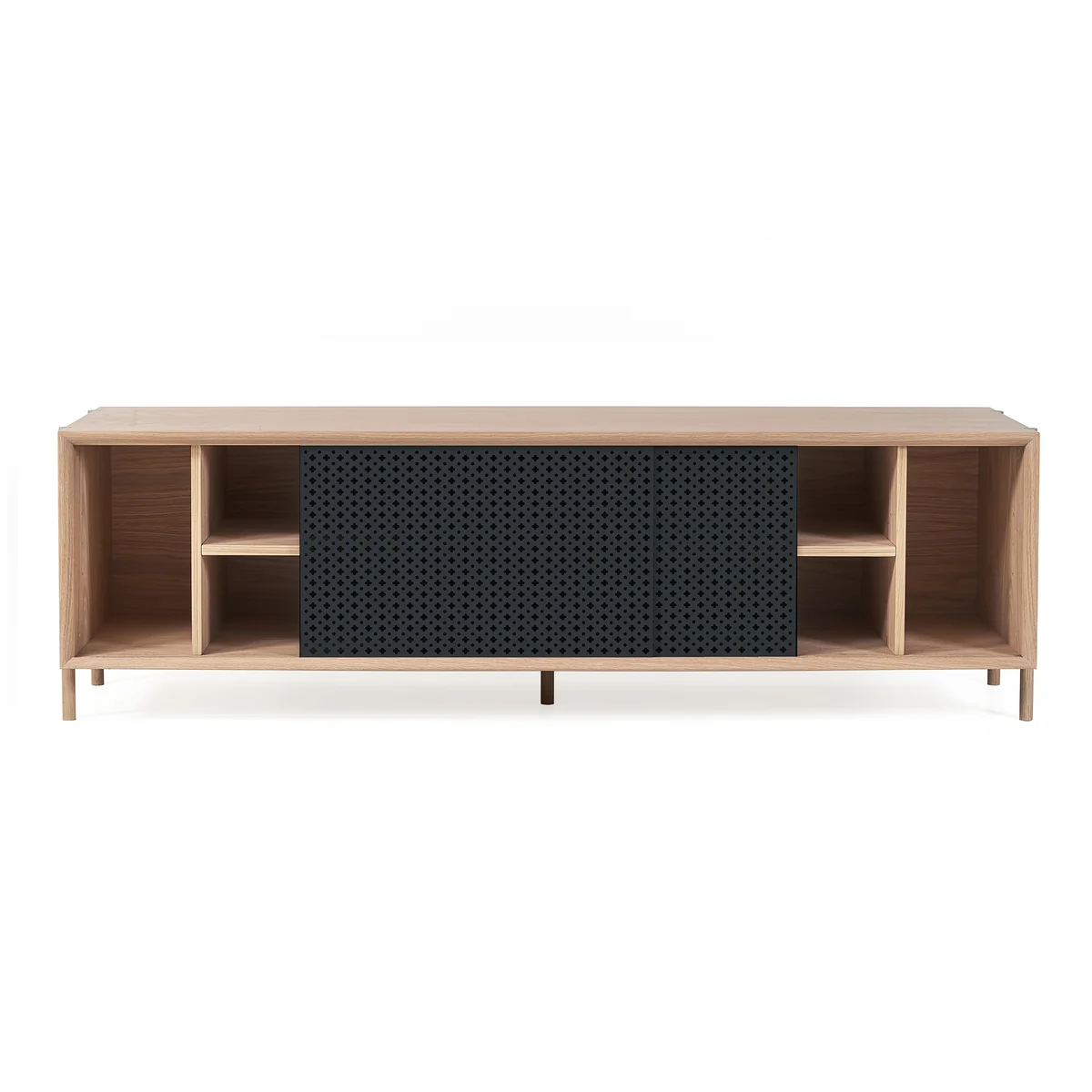 The Gabin Sideboard from the French manufacturer Hartô is characterized by its harmonious mix of materials and detailed design. The body of the sideboard is made of MDF panels with high-quality oak or walnut wood, while the sliding doors are made of steel. These have filigree perforations reminiscent of the art of basket weaving.