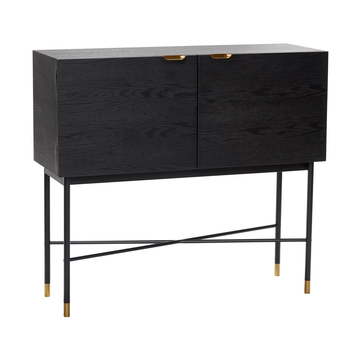 The chest of drawers with 2 compartments from Hübsch Interior is a stylish sideboard in black, which fits effortlessly into the living ambience with its universal look - in the living room, office, bedroom, hallway and all other rooms. The ash wood chest of drawers rests on a slender brass frame, which is decorated with shiny accents on the feet. Polished brass sections serve as door handles for the compartments.