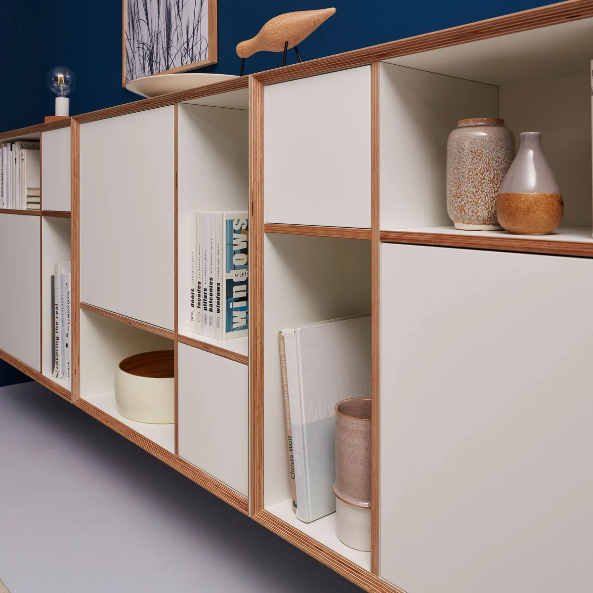 The Vertiko sideboard is made of 18 mm birch plywood with a highly durable coating or lacquered MDF. Available in many different colours, the Vertiko adapts perfectly to every living ambience. Several sideboards in combination and stacked on top of each other result in a special shelving system for the wall or on the floor. A base that beautifully lifts the sideboard from the floor is available separately.