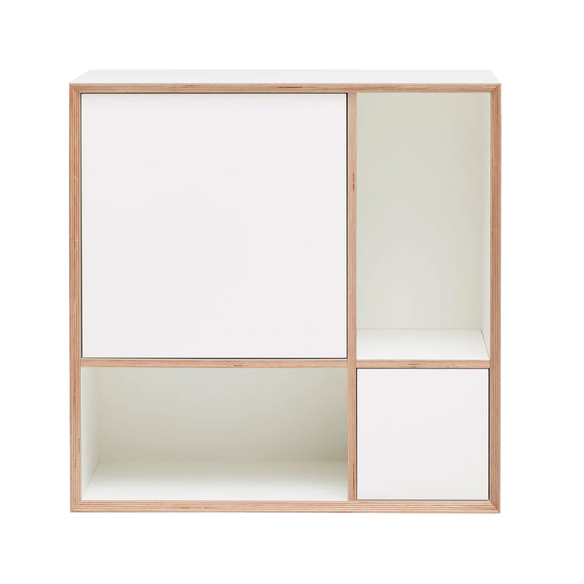 The Vertiko Sideboard from Müller Small Living is a versatile box furniture that can be hung on the wall or placed on the floor. The sideboard can be individually and flexibly supplemented both vertically and horizontally with further Vertiko modules. The square basic shape, the arrangement of the two handleless doors with push-to-open mechanism and the two open compartments ensure an exciting and graphic appearance. Different open and closed areas offer different possibilities of use at the same time.