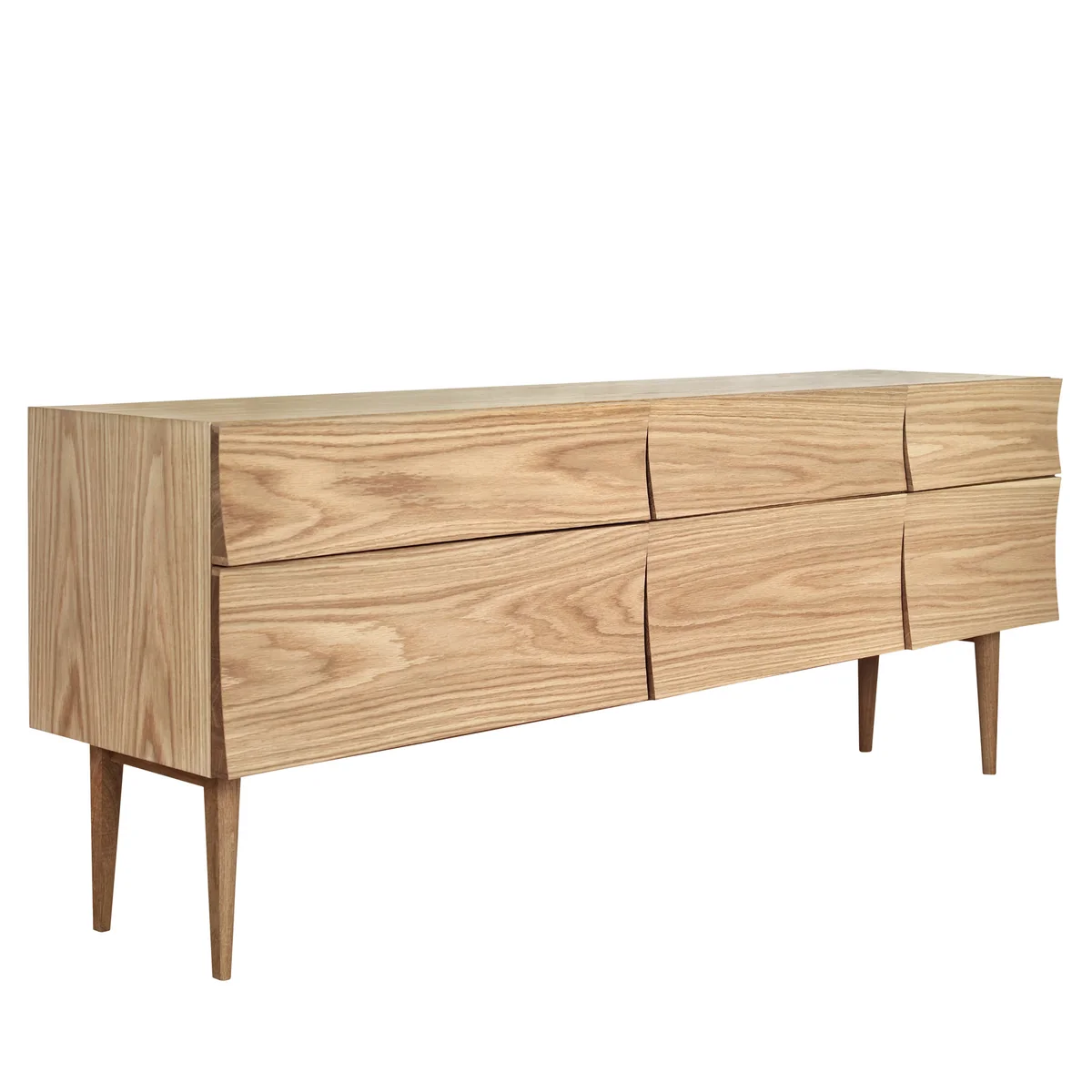 The wood from which the front of the Reflect sideboard is made has different depths and curves. The corners of the individual drawers arch forward, imitating the shadow cast and the reflections of light on the wood.
