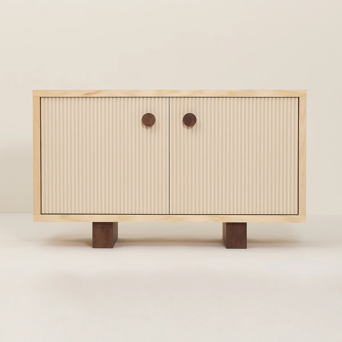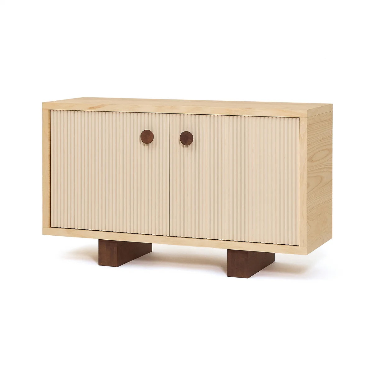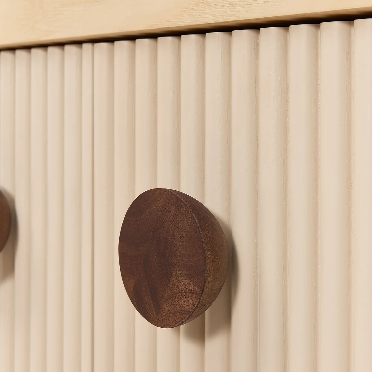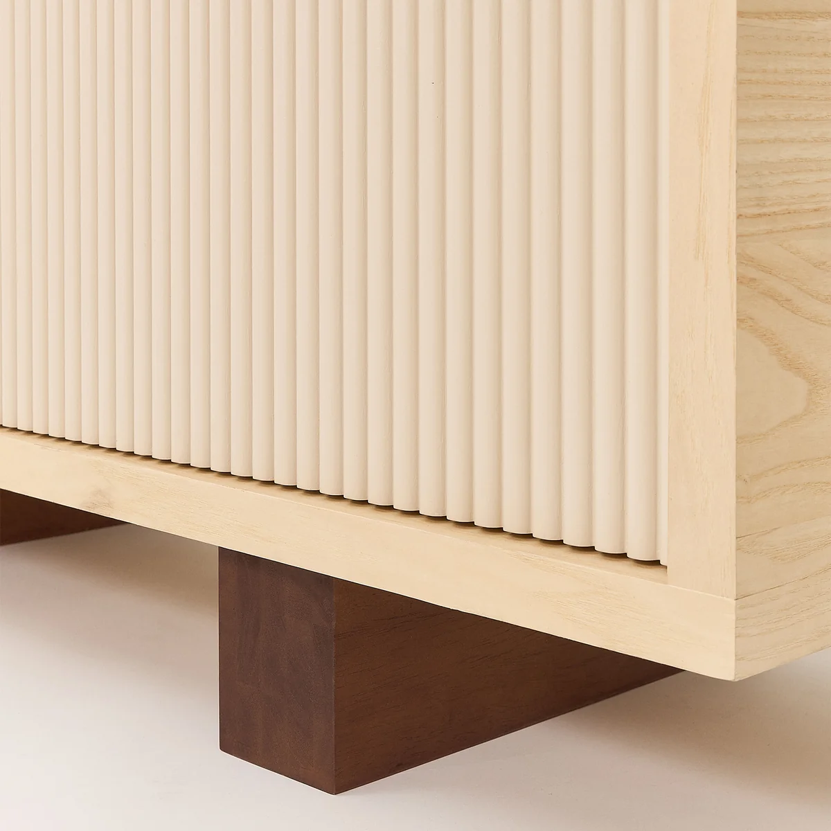 The finely grooved doors create a fascinating interplay of light and shadow and invite children to discover the surfaces tactilely. Rounded, high-contrast handles ensure child-friendly handling without disturbing the purist design. The striking legs, inspired by Japanese geta sandals, round off the overall look and give the piece of furniture a floating, timeless character.